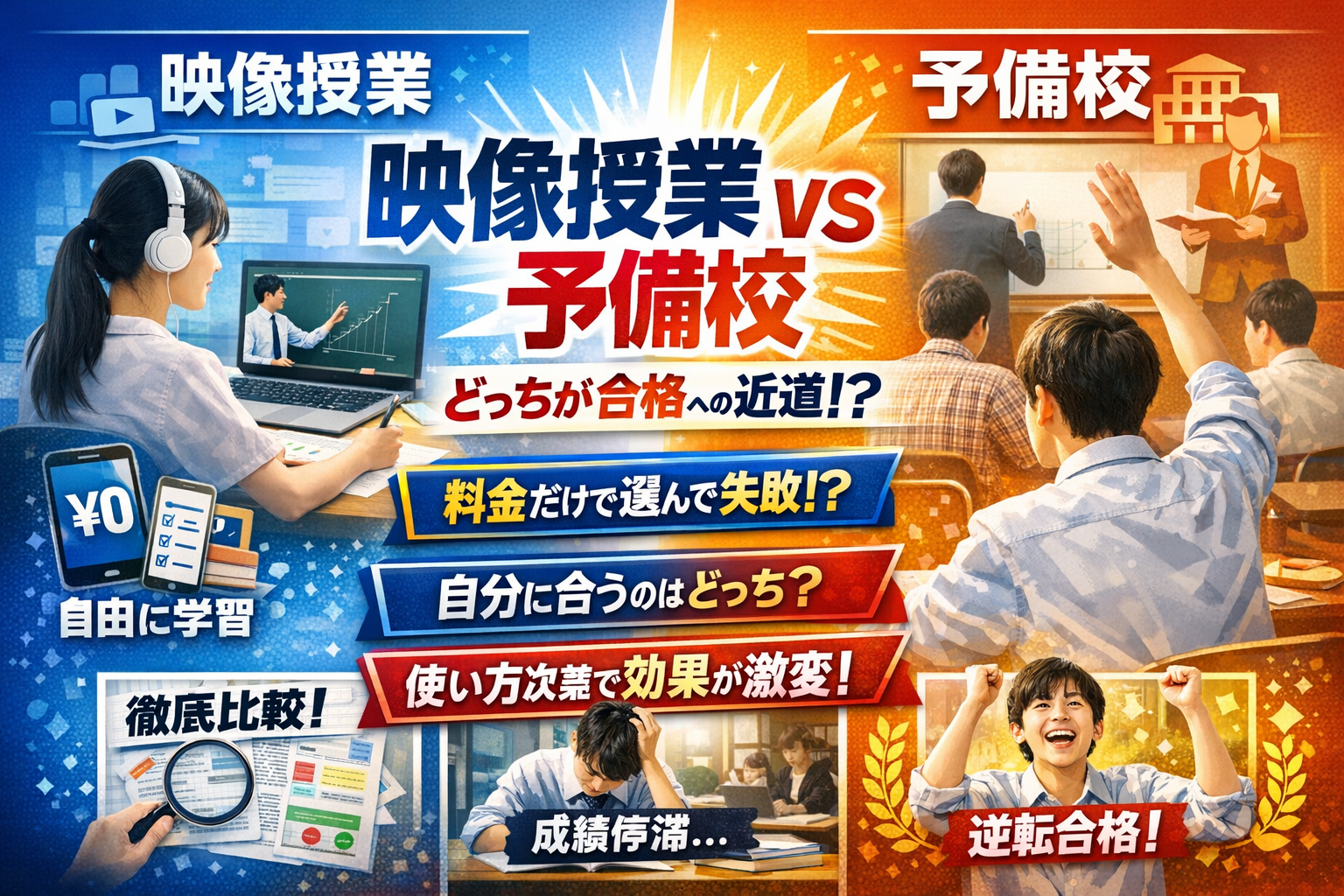 大学受験の映像授業や予備校を比較するとき、多くの方が「映像授業ランキング」「月額料金の安さ」「メリットデメリットまとめ」だけで候補を絞ります。ですが、その選び方のまま申し込むと、安く見えたのに年間総額は割高、しかも成績はほとんど伸びないというパターンになりやすいのが現場の実態です。映像授業は意味ない、時間の無駄だという口コミの多くは、サービス自体より「選び方」と「使い方」を間違えた結果として生まれています。この記事では、スタディサプリや無料映像授業と、東進・河合塾マナビスなどの映像授業塾を同じ土俵で比較しつつ、料金や合格実績だけでなく、質問対応や学習管理、自習環境といった成績を左右する裏側の条件まで分解します。そのうえで、偏差値帯や志望校レベル、自走型かサポート必須かといったタイプ別に、映像授業だけで完結してよいラインと、予備校併用が必要になるラインを具体化します。無料体験やスタディサプリだけでどこまで攻めて、どのタイミングで有料の映像授業塾に切り替えるとコスパが最大化するかも、現場の相談事例から整理しました。どれが一番安いかではなく、あなたやお子さんにとって「どれなら合格まで走り切れるか」を判断するための実務的な比較軸が、この記事の中にすべて揃っています。