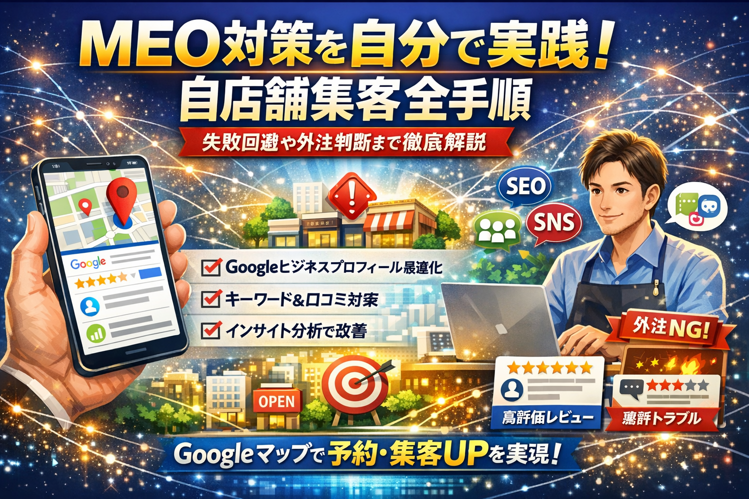 本記事では、MEOとは何か、SEOとの違い、Googleビジネスプロフィールの登録とオーナー確認、NAPやカテゴリ設定、キーワード選定、写真や投稿の整え方、口コミの集め方と返信、インサイト分析による改善までを一気通貫で整理します。さらに、更新停止や口コミ炎上、ガイドライン違反、業者丸投げといった失敗事例、自分でやるラインと外注すべきライン、AI検索やSNSとの連携まで、現場視点で踏み込んで解説します。ここで整理された「自分でできるMEO対策」を一度体系的に押さえておくかどうかで、今後の自店舗集客の伸び方は大きく変わります。