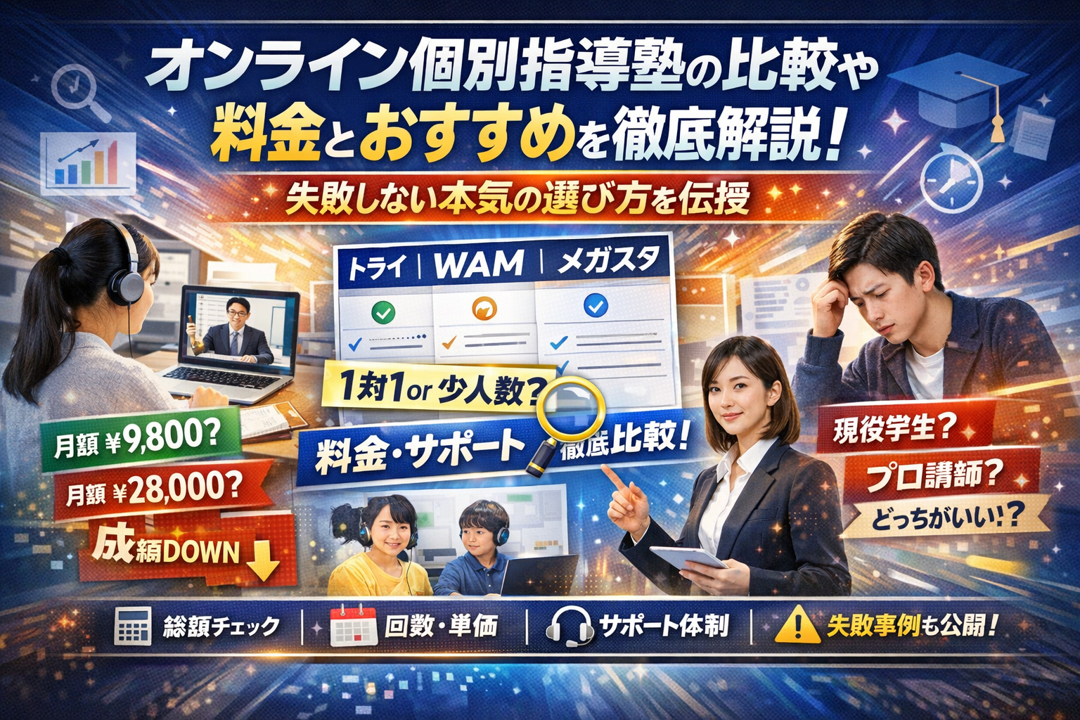 「どこも良さそうに見えて決めきれない…」という保護者ほど、公式サイトの“見せ方”に振り回されています。ここではトライ、WAM、メガスタ、そら塾、トウコべ、スタディサプリなどを軸に、「料金だけでは分からない差」を整理します。