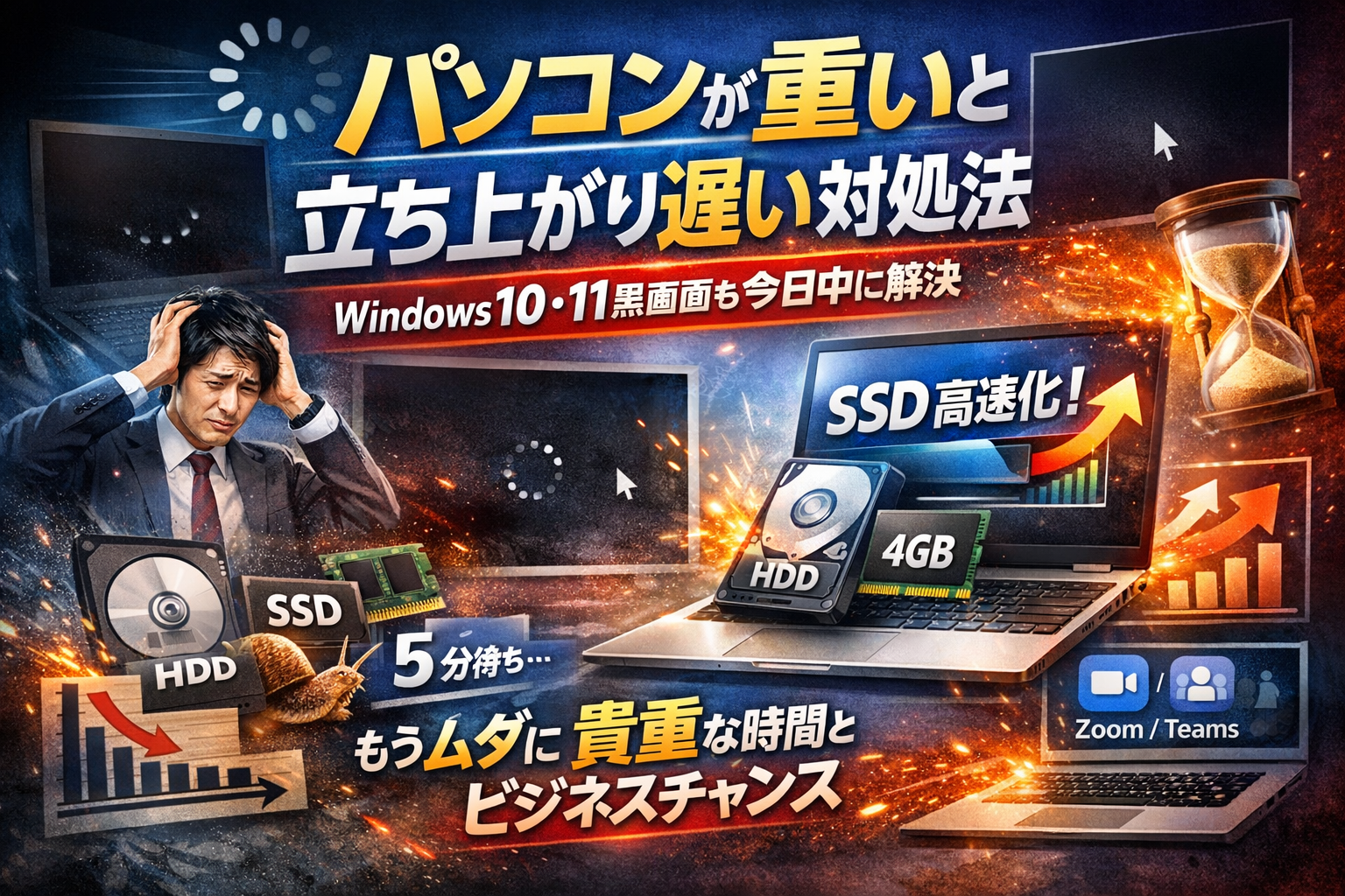 朝イチの起動に毎回5分以上奪われ、黒い画面やくるくるを眺めながらオンライン会議の開始時刻だけが迫ってくる。この状態を放置すると、失っているのは時間ではなく機会と信頼です。スタートアップアプリの整理や不要ファイル削除、再起動で多少は改善しますが、それだけでは「異常に遅い」Windows10・11の根本原因までは潰し切れません。ストレージ容量不足、HDDのまま運用、メモリ4GB以下、セキュリティソフトの多重インストールといった要因が絡むと、場当たり的な対処ではまたすぐ再発します。