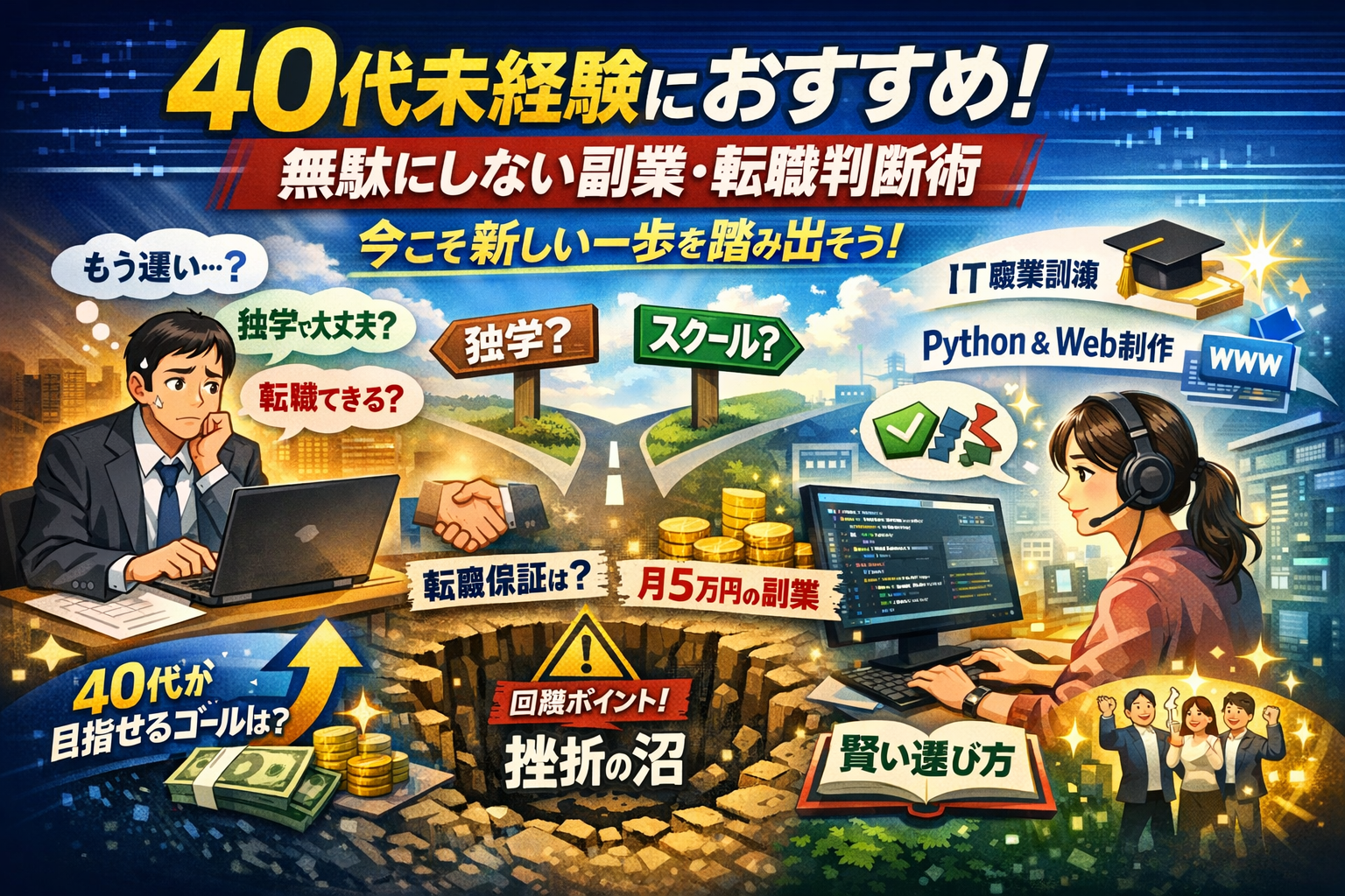 40代でPCを前に固まっている人を、現場で何人も見てきました。子どもの学費、住宅ローン、会社の将来不安。頭では「ITスキルが必要」と分かっていても、失敗した時のダメージが20代の比ではありません。だからこそ、甘い希望論でも「やめとけ」一辺倒でもない、損得を冷静に計算できる材料をそろえたくてこの記事を書いています。