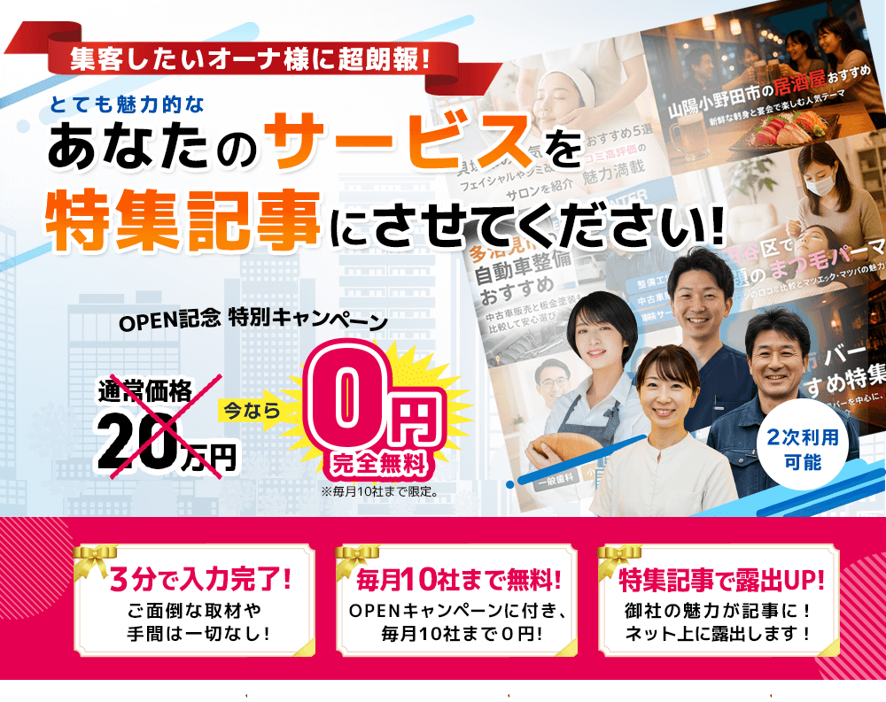 地域で選ばれるお店や企業様 特集エントリーページ4 2026.01.172026.02.13 掲載イメージ エントリーフォーム お店の名前 お店の所在地 お店の電話番号 お店のホームページURL[必須] 主な業種・サービス内容 ご担当者さまのお名前 [必須] ご担当者さまの役職 —以下から選択してください—代表広報その他 ※「その他」を選択された場合は、こちらにご入力ください(任意) メールアドレス [必須] 携帯電話番号 [必須] 【アンケート】市場調査のため下記ご興味あることにチェックください(必須ではございません!) 興味ないAI対策(LLMO対策)Googleマップ対策(MEO)インスタ運用(SNS運用)インフルエンサーマーケティングSEO対策ブログ対策 お問い合わせ・ご要望および個人情報は慎重にお取り扱いさせて頂きます。詳しくはプライバシーポリシーをご覧ください。 プライバシーポリシーの内容を確認し、同意する