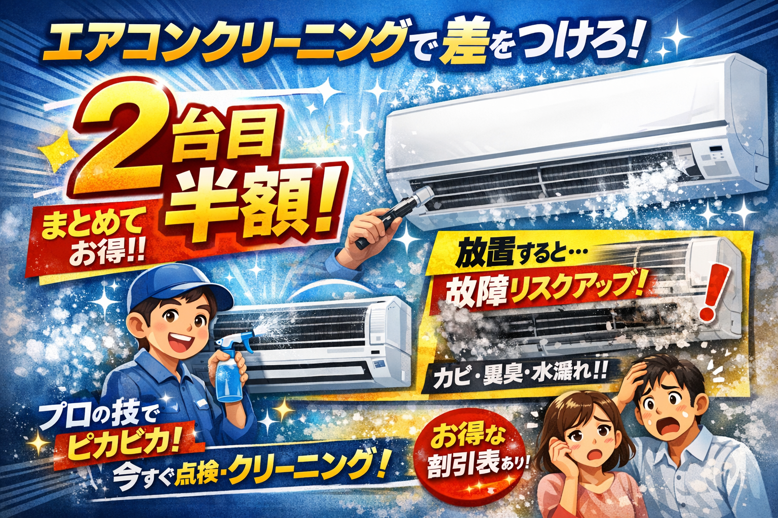 エアコンクリーニングの「2台目割引」で得をしたつもりが、明細を見ると実質ほぼ通常料金。共働き家庭や実家ケア世代の問い合わせを見ていると、このパターンが驚くほど多いです。原因は、価格よりも前に確認すべき「同一世帯条件」「製造年数10年ライン」「壁掛けか天井かといったタイプ違い」を、キャンペーンバナーの勢いで読み飛ばしていることにあります。