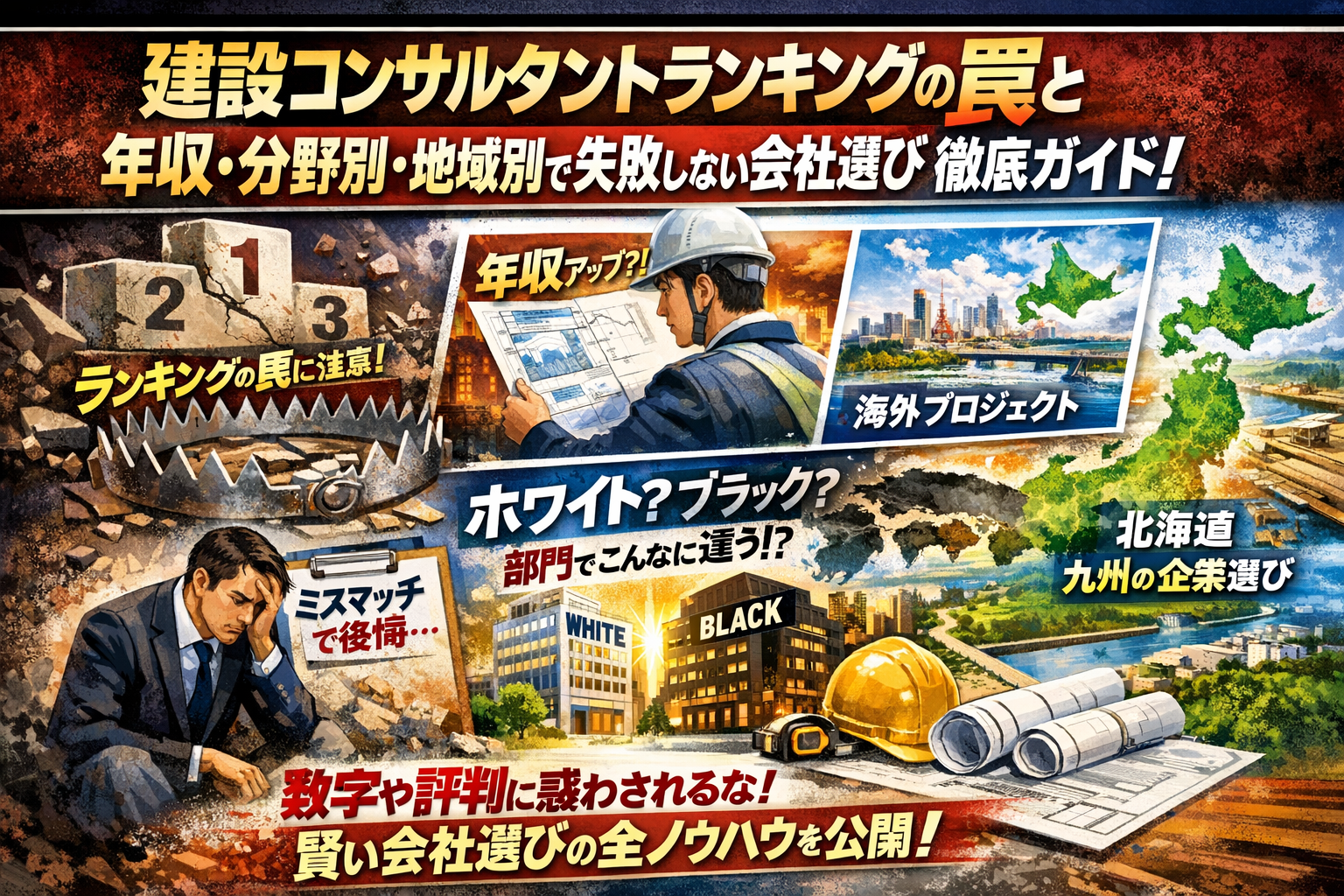 本記事では、日経コンストラクションや建設コンサルタント会社183社ランキングなどの数字の意味と限界を整理しつつ、「建設コンサルタントはやめとけ」「年収が低い」といった評判の背景を、技術士・RCCM取得後の年収逆転やホワイト・ブラックの部門差まで踏み込んで解きほぐします。さらに、北海道や九州など地域別の中堅企業の実力、東京本社の大手との違い、土木設計・地質・測量・建築コンサルでのキャリアの伸び方を比較し、あなたの条件を軸に会社を絞り込む実務的な判断基準を提示します。ランキングの「序列」を眺めるだけの情報収集から一歩進み、失敗しない建設コンサルタント企業選びに必要な視点を、この一記事で一気に揃えてください。