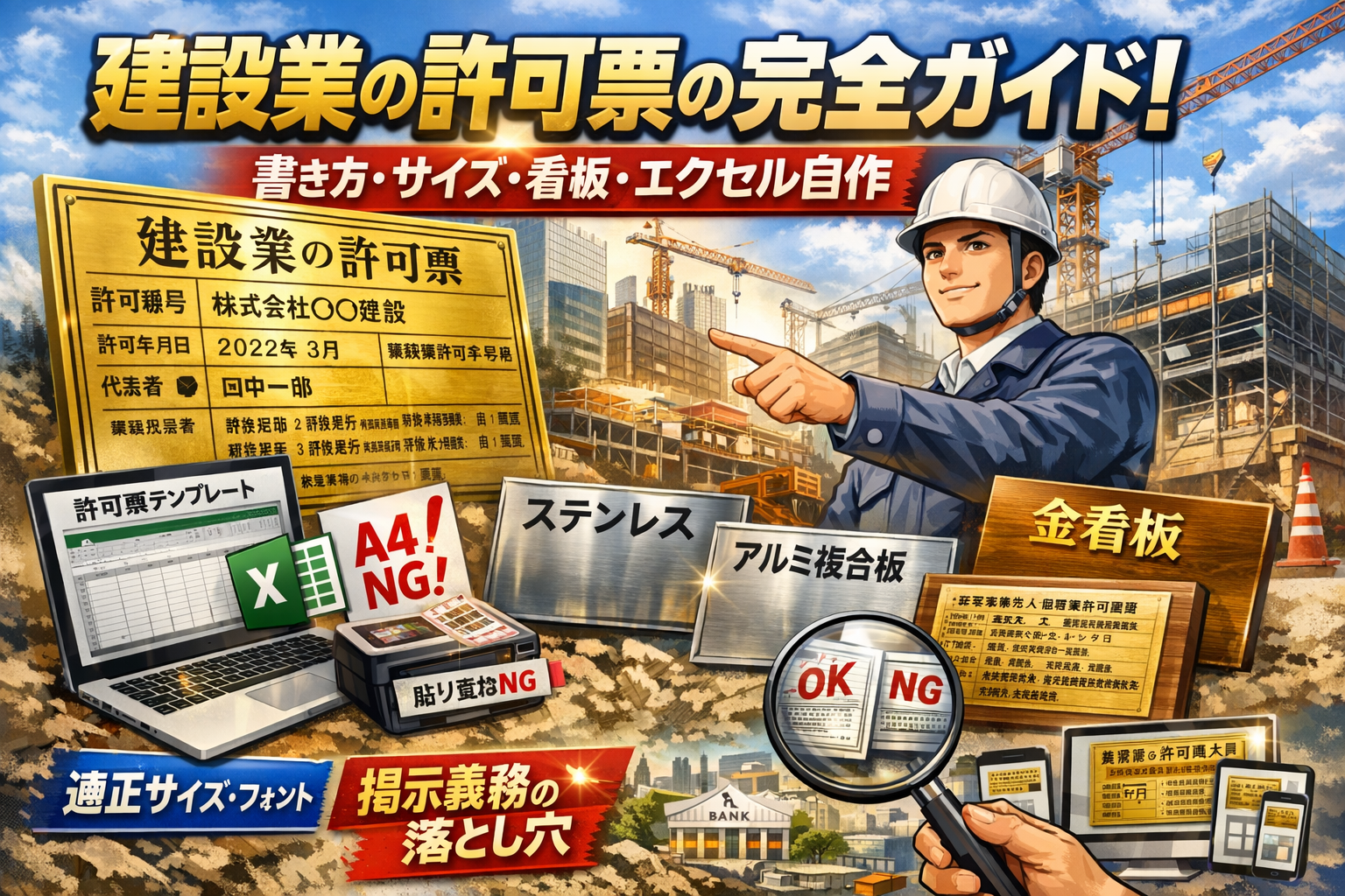 建設業許可を取ったのに、建設業の許可票を「とりあえずエクセルでA4印刷」「とりあえず金看板をネットで発注」で済ませると、気付かないうちに信用と受注を削っています。サイズが三十五センチ×四十センチ未満のまま営業所に掲示していたり、現場用と事務所用の区別や専任の有無の書き方を誤ったり、更新のたびにテプラだらけの許可票看板を放置している会社は少なくありません。元請や監理側、銀行担当、求職者はそこで「法令対応レベル」と「会社の丁寧さ」を一瞬で判断します。この記事では、建設業の許可票とは何かという基本から、営業所用と工事現場用の様式、書き方の記載例、サイズとフォントの実務基準、エクセル自作テンプレートと金看板・アルミ複合板・ステンレスプレート等の比較までを一気通貫で整理します。そのうえで、掲示義務違反になりやすい落とし穴や、おしゃれな建設業許可看板にするときの法律上の限界ライン、ホームページやGoogleビジネスプロフィールで「見せる武器」に変える方法まで踏み込みます。「明日からの工事現場にどのレベルの許可票を持っていけば恥をかかないか」まで、迷わず判断できる状態をこの1本で作り切ります。