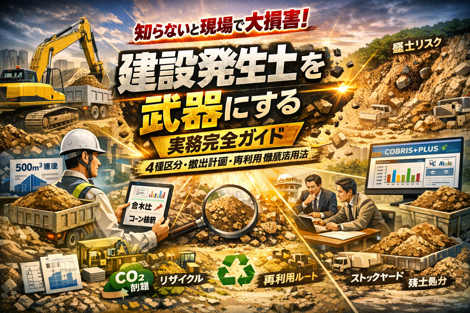 本記事は、建設発生土とは何かという基本から、残土・一般残土・建設汚泥との違い、第1種〜第4種建設発生土の種類と利用基準、コーン指数や含水比を使った土質判定、m3とt換算、ストックヤードや残土処分場の選び方までを、現場でそのまま使えるレベルで整理します。あわせて、資源有効利用促進法や搬出先計画制度、建設発生土情報交換システム(コブリスプラス)の実務フロー、土質改良土や工事間利用によるCO2削減とJASRA等のデータの読み方も、現場代理人と受入事業者の視点で一気につなぎます。