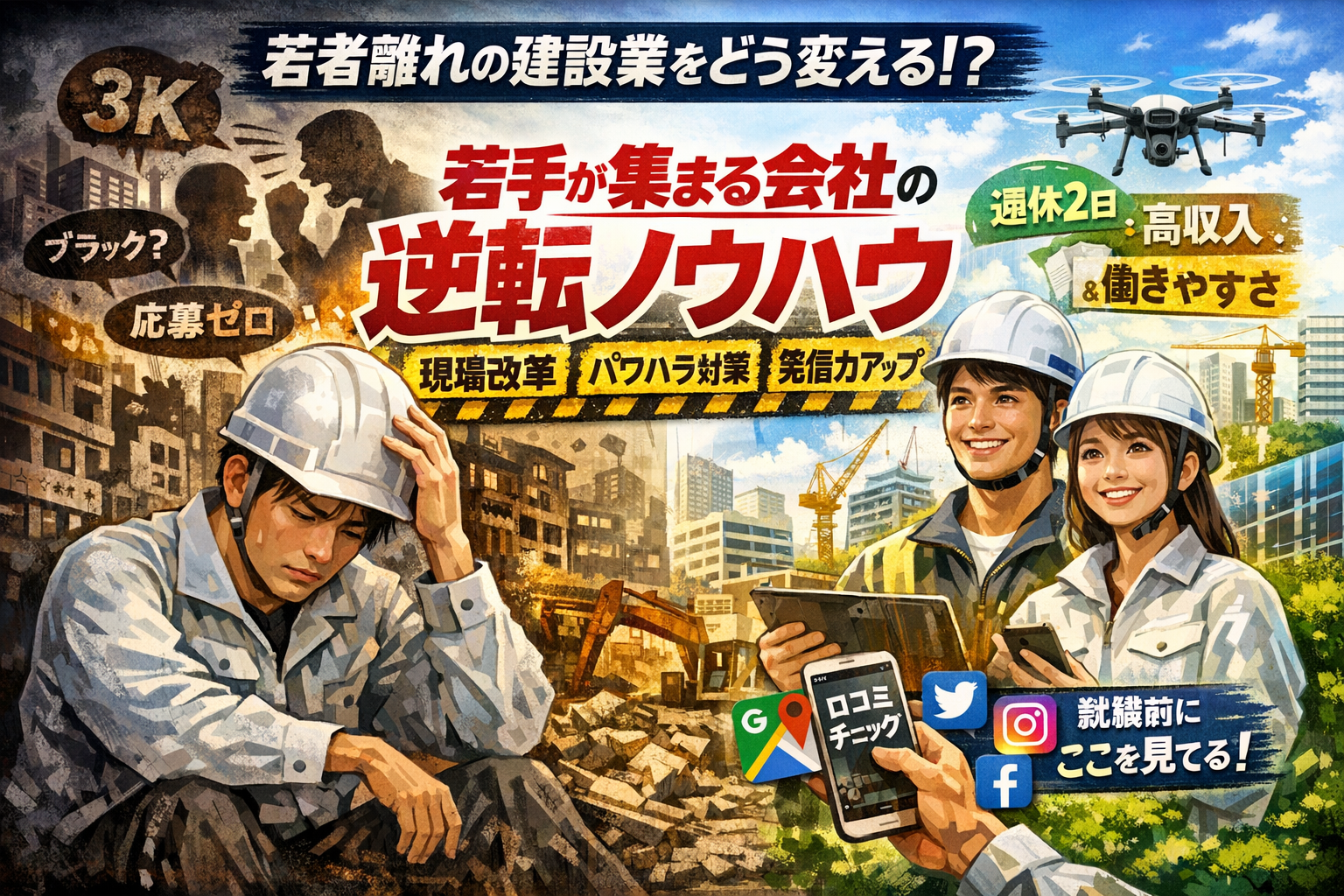 本記事では、建設業界の年齢構成や3K・長時間労働といった表面的な理由だけでなく、若者が応募前にGoogleマップやSNS、口コミをどうチェックし「この会社はない」と判断しているかを、現場の支援経験に基づいて具体的に解き明かします。そのうえで、「新三K」を実現し若手が定着している中小建設業が、現場とデジタル発信をどう設計しているのか、逆に応募ゼロに陥る会社の失敗パターンとセットで示します。