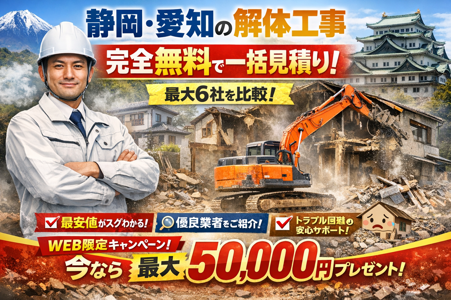 | 記事前半(クオカード付き解体見積もりの実態〜見積もり構造〜典型トラブル〜静岡・愛知のキャンペーン事情) | キャンペーンの有無に関わらず、見積書のどこで価格操作が起きやすいかを見抜き、追加費用や廃棄物処理、距離コストを事前に織り込んだ会社選びができる | 「特典や税込総額だけで選び、後から埋設物・アスベスト・残置物・近隣クレームなどの見えないコストに追われる」という構造的な失敗 |