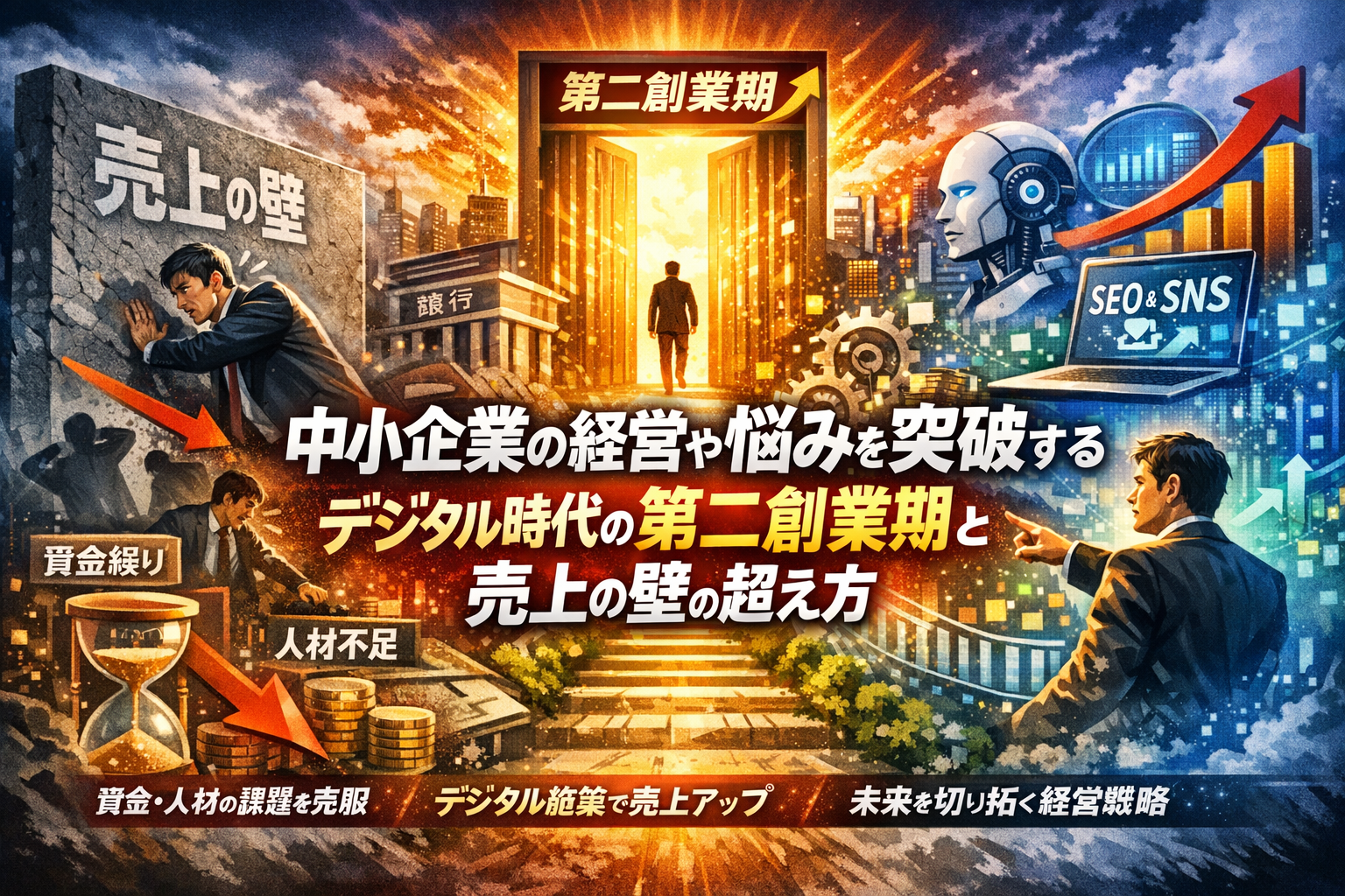 本記事は、「中小企業 経営 悩み 突破」を掲げながら、一般論や精神論ではなく、企業成長期・成熟期・衰退期のどこで組織と事業構造が詰まっているのかを冷静に分解し、売上高の壁と第二創業期を同時に乗り越えるための実務ロジックを示します。潰れる前兆となる社長の行動パターン、ミドルマネジメント不在が生む社長の分身問題、銀行との資金の付き合い方を整理したうえで、SEOやMEO、SNS、AIといったデジタル施策が「アクセス増」ではなく利益と安定構造の構築にどう効かせられるかまで踏み込みます。