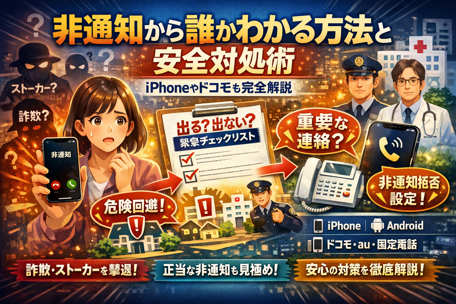 本記事では、非通知の構造と限界を最初に切り分けたうえで、「出るか出ないか」を即決するチェックリストと、出てしまったときの具体的な対処法を示します。そのうえで、iPhoneやAndroidの設定、ドコモ・au・ソフトバンク・UQ・固定電話の非通知着信拒否や番号通知リクエストの手順を、迷わず操作できるレベルまで解説します。さらに、詐欺やストーカーと正当な非通知(病院・学校・警察・役所)の見分け方と、警察や消費生活センターへの相談ラインまで一本のルートに落とし込みました。