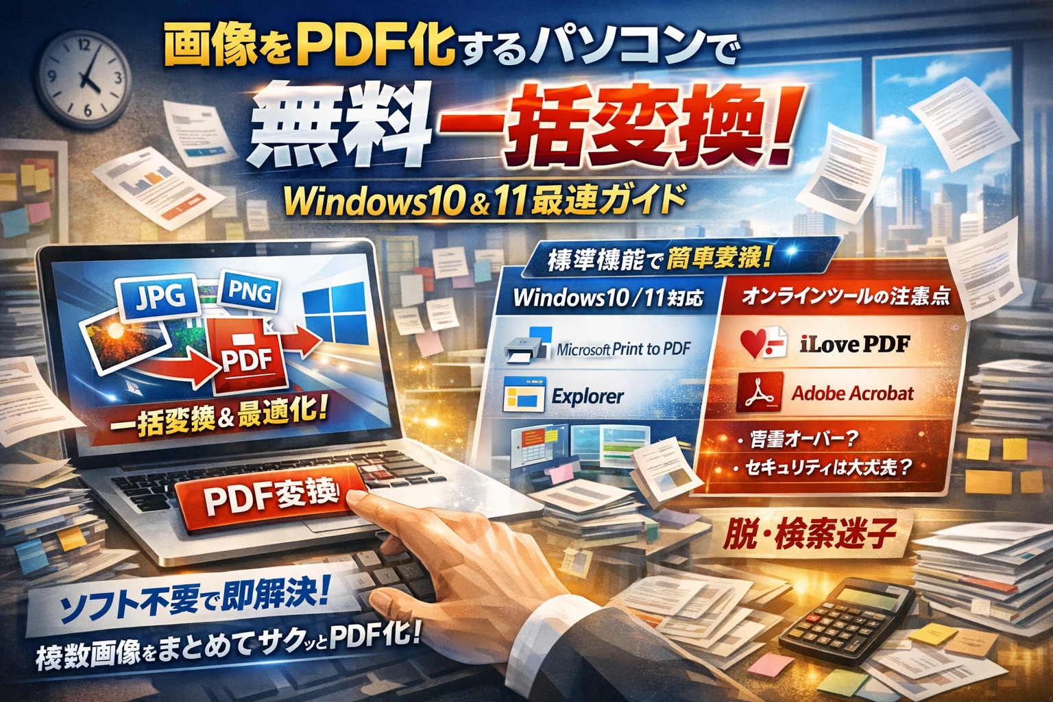 このガイドでは、パソコンに追加ソフトを入れずに画像や写真をPDF化する最速ルートを、Windows10/11とMacそれぞれについて具体的に示します。Microsoft Print to PDFやエクスプローラー右クリックの使い方から、iLovePDFやAdobe Acrobatオンラインを「使う場面」と「避ける場面」の線引き、経費精算や申請書でのレイアウト崩れ・容量オーバーの防ぎ方まで、実務でつまずく箇所を先回りして解消します。
