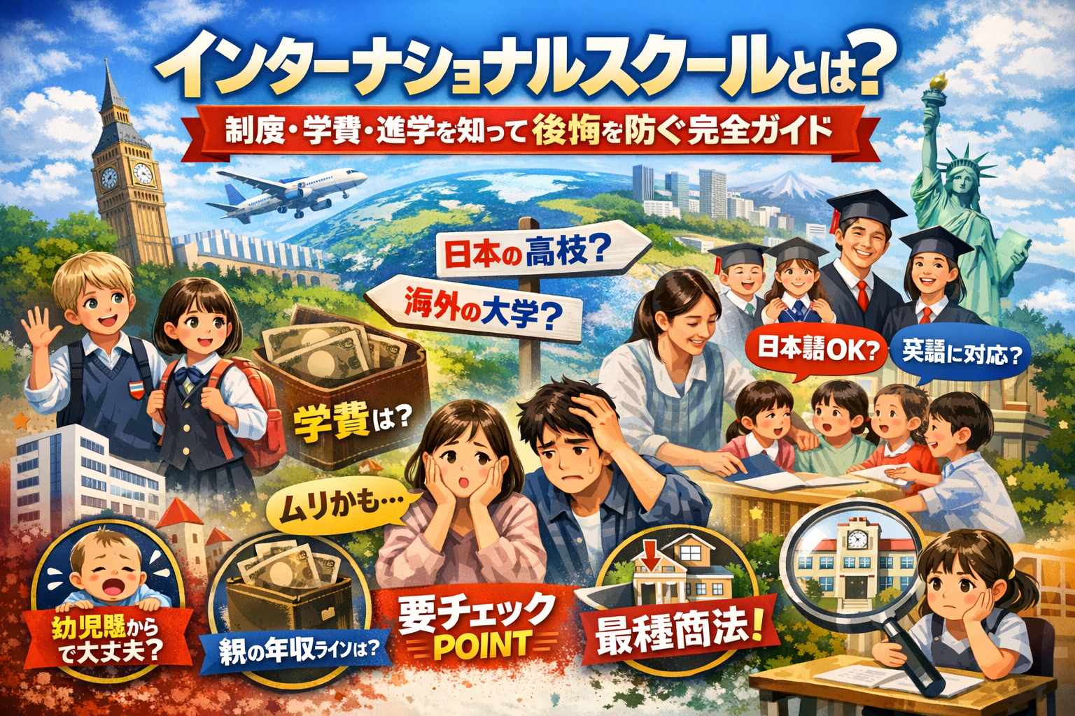 本記事では、インターナショナルスクールとはどんな子が通う学校かを簡単に押さえたうえで、一条校・各種学校・外国人学校の違い、日本の高校受験や大学進学への影響、親の年収と学費総額の現実、日本人割合や日本語サポートの見抜き方までを一気通貫で整理します。さらに、0〜6歳から小学校以降の「後悔パターン」と、見学時に確認すべき具体的な質問をチェックリストとして提示します。この数分のインプットだけで、雰囲気ではなく制度とお金と進路に基づいて判断できるようになり、インターナショナルスクール選びで失敗する確率を大きく下げられます。