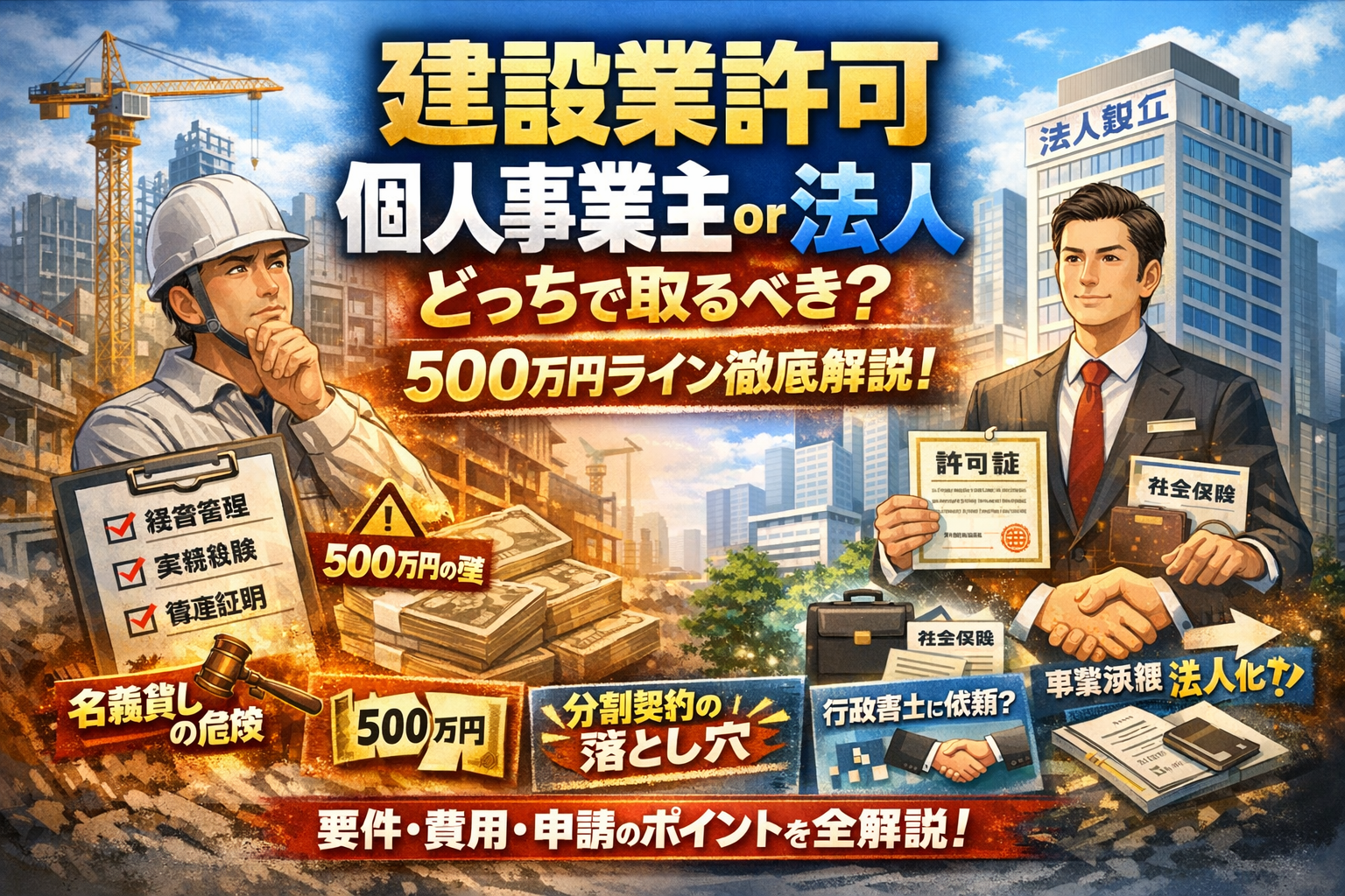 500万円を超える工事が増え、「そろそろ建設業許可を取ってください」と元請に言われているのに、個人事業主のまま取るべきか、法人を作ってからにすべきか判断できない。この状態が続くほど、受注機会と信用力を静かに失っています。しかも現場では「500万円以下なら分割すれば大丈夫」「名義貸しで建設業許可証だけ借りればいい」といった裏ワザが飛び交いますが、多くはリスクの中身が理解されないまま使われています。