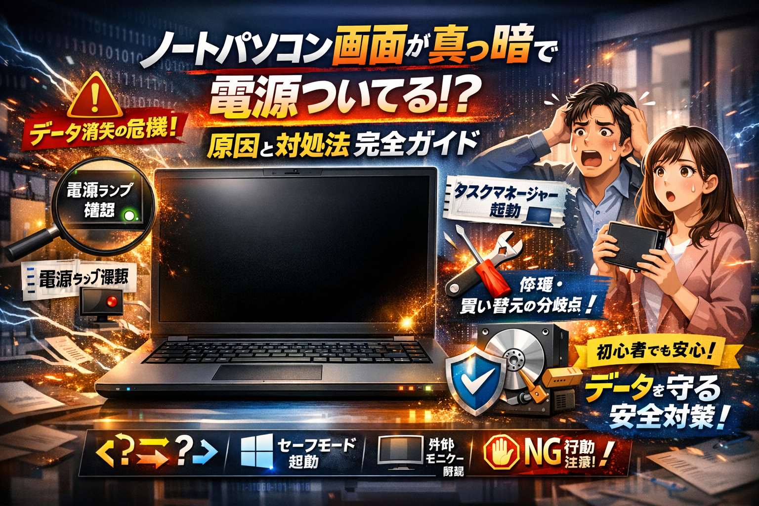 ノートパソコンの電源はついているのに画面が真っ暗、マウスカーソルだけ動く、ファンは回る、音は出る。会議や納期の直前にこれが起きると、多くの人が「とりあえず電源長押し」「何度も再起動」という最悪の選択から始めてしまいます。その結果、データ消失リスクだけを上げて、肝心のトラブル原因は曖昧なままという「見えない損失」を積み上げています。