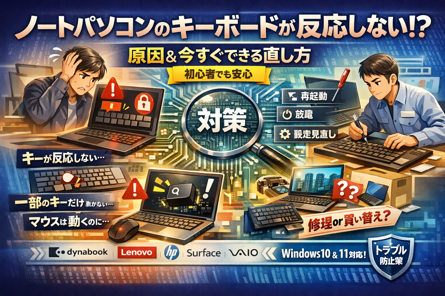 ノートパソコンのキーボードが急に反応しない。それだけで、打ち合わせもレポート提出も一気に止まり、仕事そのものの価値が目減りします。しかも「再起動すれば直るはず」「放電すればいいらしい」といった一般的な対処だけを繰り返すと、時間もデータも無駄に削られます。