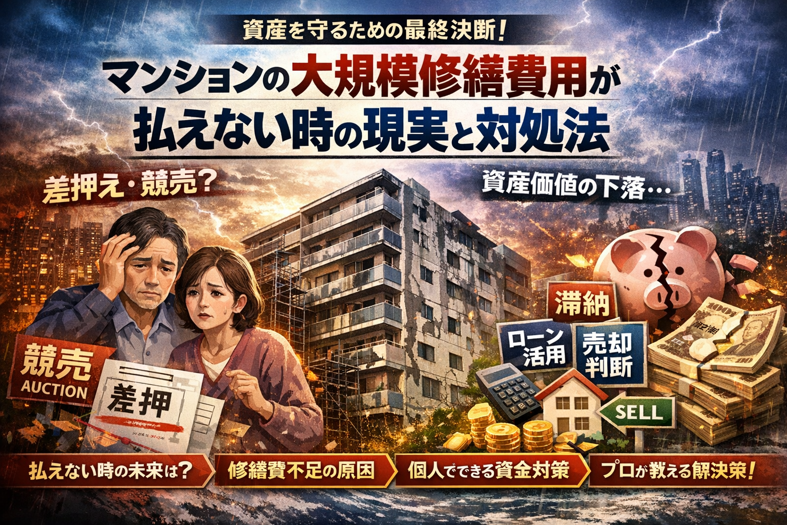 本記事では、マンション大規模修繕費用が払えないときに起こる現実と、修繕積立金不足の構造、築20年・30年や2回目・3回目で費用が高騰しやすい理由を整理したうえで、延ばせる修繕と絶対に延期できない修繕の線引き、管理組合への相談、ローンやリバースモーゲージ、売却の向き不向きまで実務レベルの対処法を比較します。さらに、年齢や収入、ローン残債から「今このマンションにとるべき戦略」を診断できるチェックリストも用意しました。
