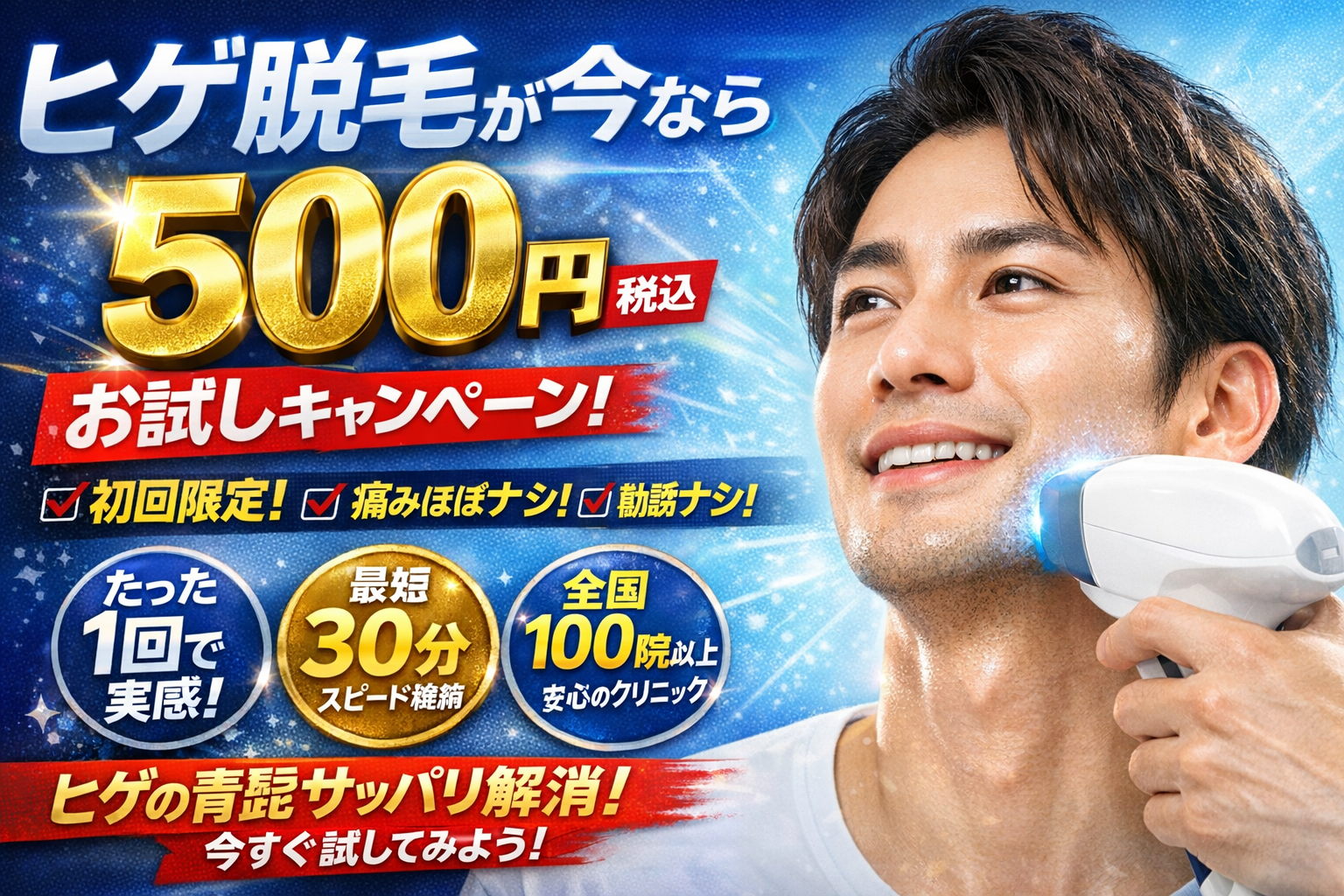 毎朝ヒゲを剃っても午後には青く浮く。メンズ脱毛の広告で「ヒゲお試し500円」「初回体験コース」「メンズTBCがこの価格」と出てくると、正直かなり魅力的に見えるはずです。ランチ1回分で、長年のコンプレックスが軽くなるなら悪くない投資に思えます。