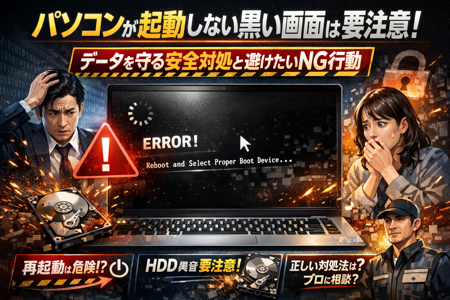 電源は入っているのに画面は真っ暗、カーソルだけ動く、ぐるぐるが終わらない…。仕事用のPCでこれが起きると、頭の中まで真っ黒になりますよね。ここで重要なのは、「慌てて触らない人ほどデータを守れる」という逆説です。最初の3分でやることは多くありませんが、やらないことを決めるだけでも、復旧の難易度と費用が大きく変わります。