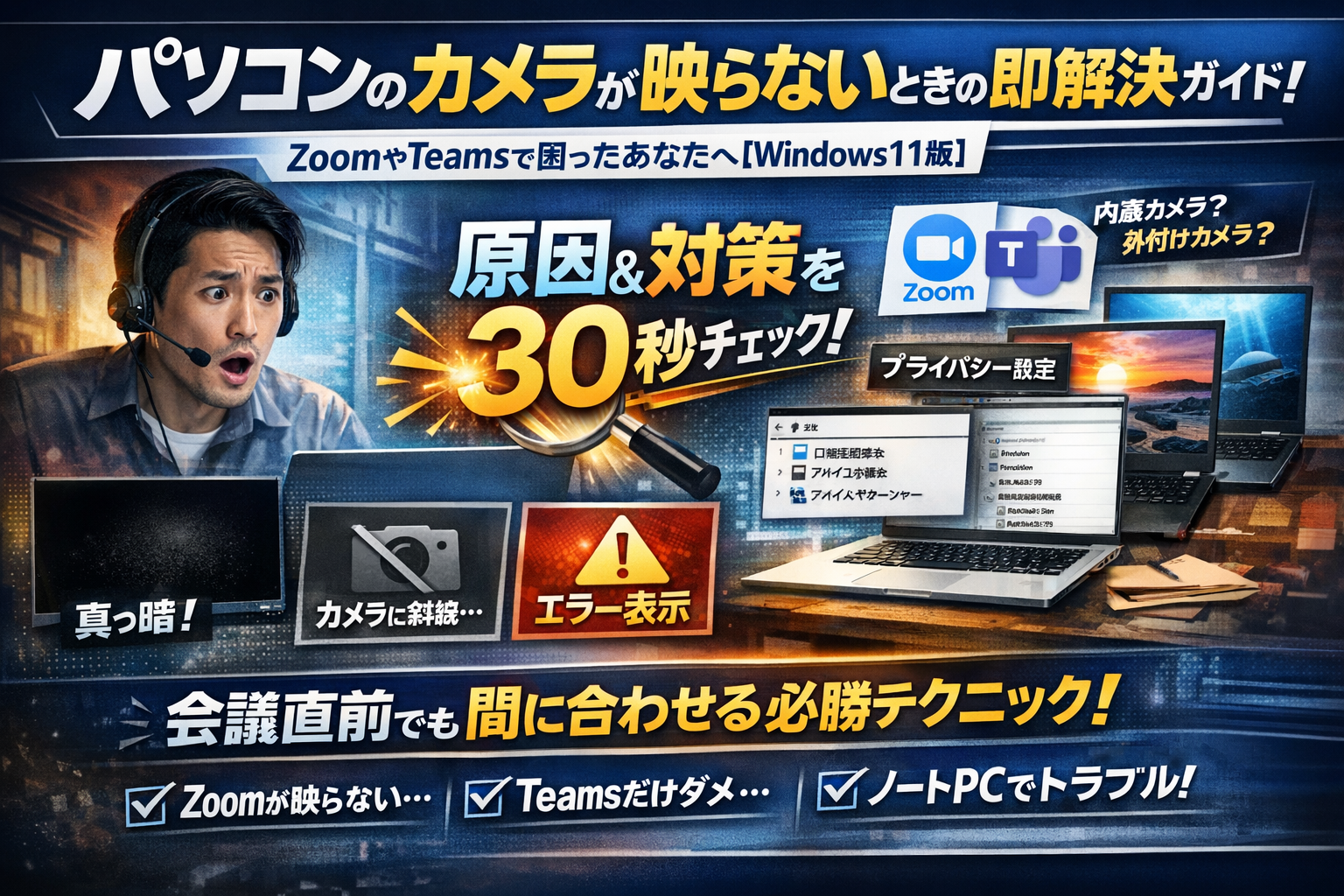 オンライン会議や面接の直前に、パソコンのカメラが真っ暗なまま動かない。Zoomでは映らないのにTeamsでは映る、LenovoやLavie、Dell、Let’s noteだけ症状が出る。ここで自己流の設定いじりを始めると、会議に遅れるだけでなく、余計なトラブルで余分な出費まで招きます。