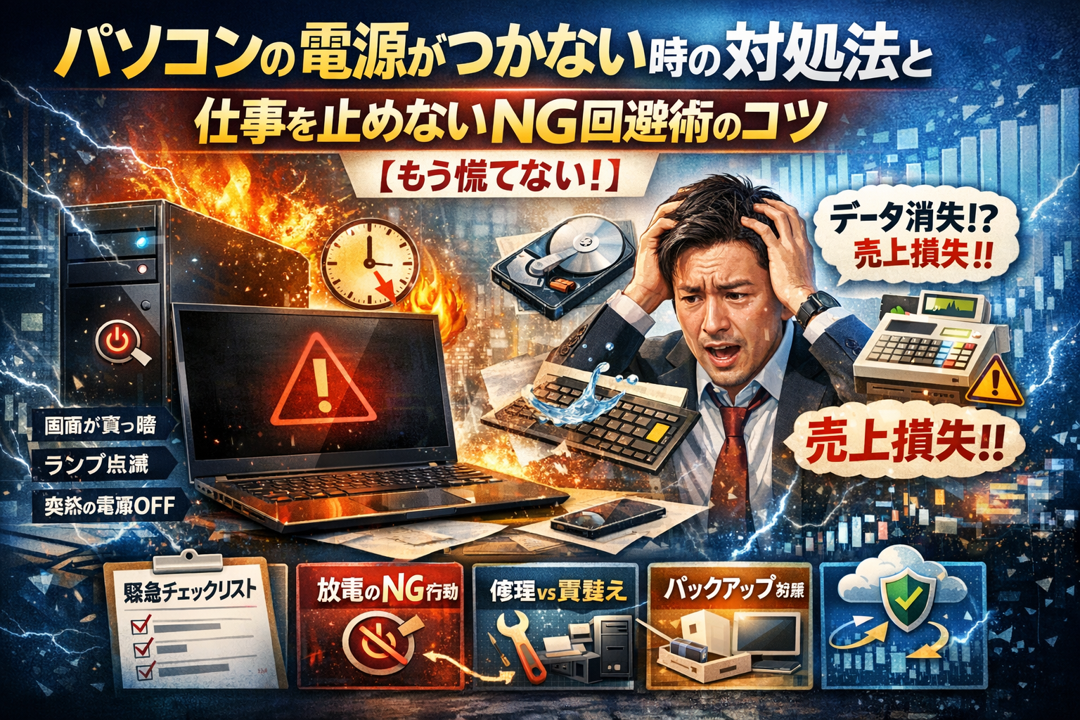 この記事では、電源がつかない状況で焦って間違った操作をしてしまうリスクを減らしつつ、次に同じ事態が起きても集客や売上を止めないための考え方を、現場で培った視点からまとめました。中小企業や個人事業主が、パソコン一台にビジネスの首根っこを握られないようにするための「現実的な保険」として役立てていただければ幸いです。