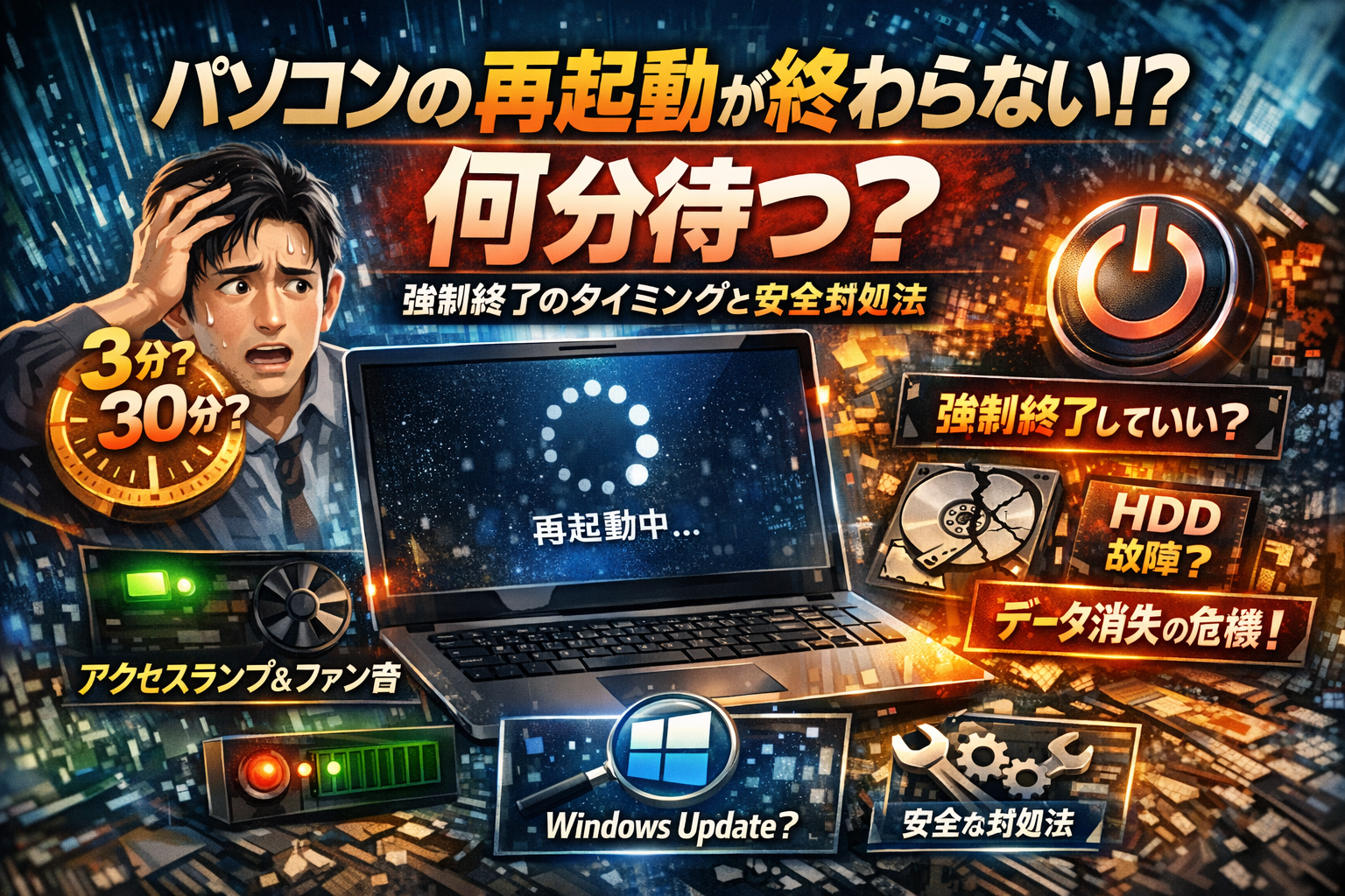 パソコンの再起動が終わらないまま、ぐるぐる画面を前に「強制終了していいのか」「このまま待つべきか」で手が止まっていないでしょうか。ここで判断を誤ると、未保存データだけでなく、システムファイルやHDD・SSD自体を傷めるリスクがあります。一方で、意味のない「半日放置」や、電源ボタン長押しの連打も、問題を長期化させる原因になります。