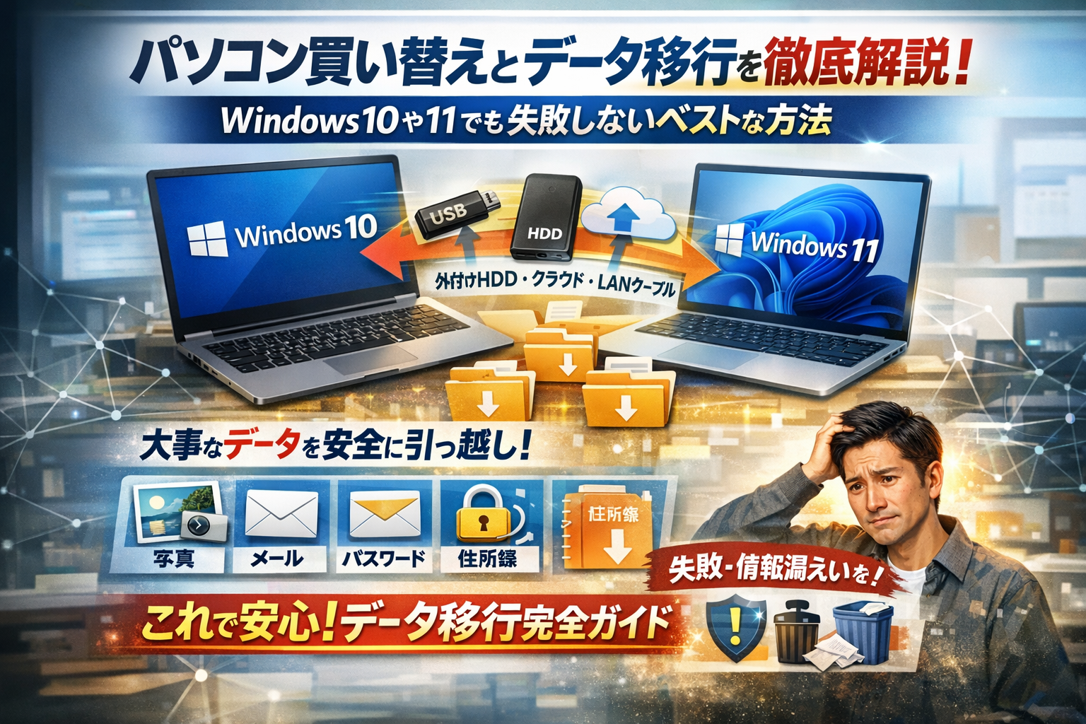 パソコン買い替えで一番損をしているのは、「勢いで新しいPCをセットアップし、あとから消えたデータや設定に気づく」ケースです。写真や仕事データだけでなく、メール、Outlook、ブラウザのお気に入りやパスワード、年賀状ソフトの住所録が抜け落ちると、金額に換算できないダメージになります。しかも「とりあえずUSBでコピー」「なんとなく引っ越しソフト」で進めるほど、復旧が難しくなります。