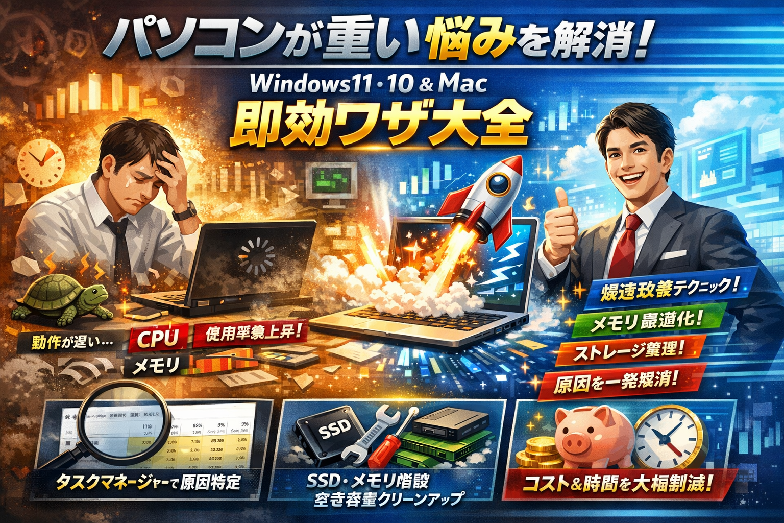 本記事は「パソコン重い解消」を、原因の特定→安全な即効ワザ→根本対策→業務効率アップまで一気通貫で整理しました。Windows11やWindows10、Macそれぞれについて、タスクマネージャーやアクティビティモニタで原因を可視化し、空き容量があるのに重い、CPUやメモリに余裕があるのに遅いといった厄介なケースも、どこから手を付ければいいかがわかります。