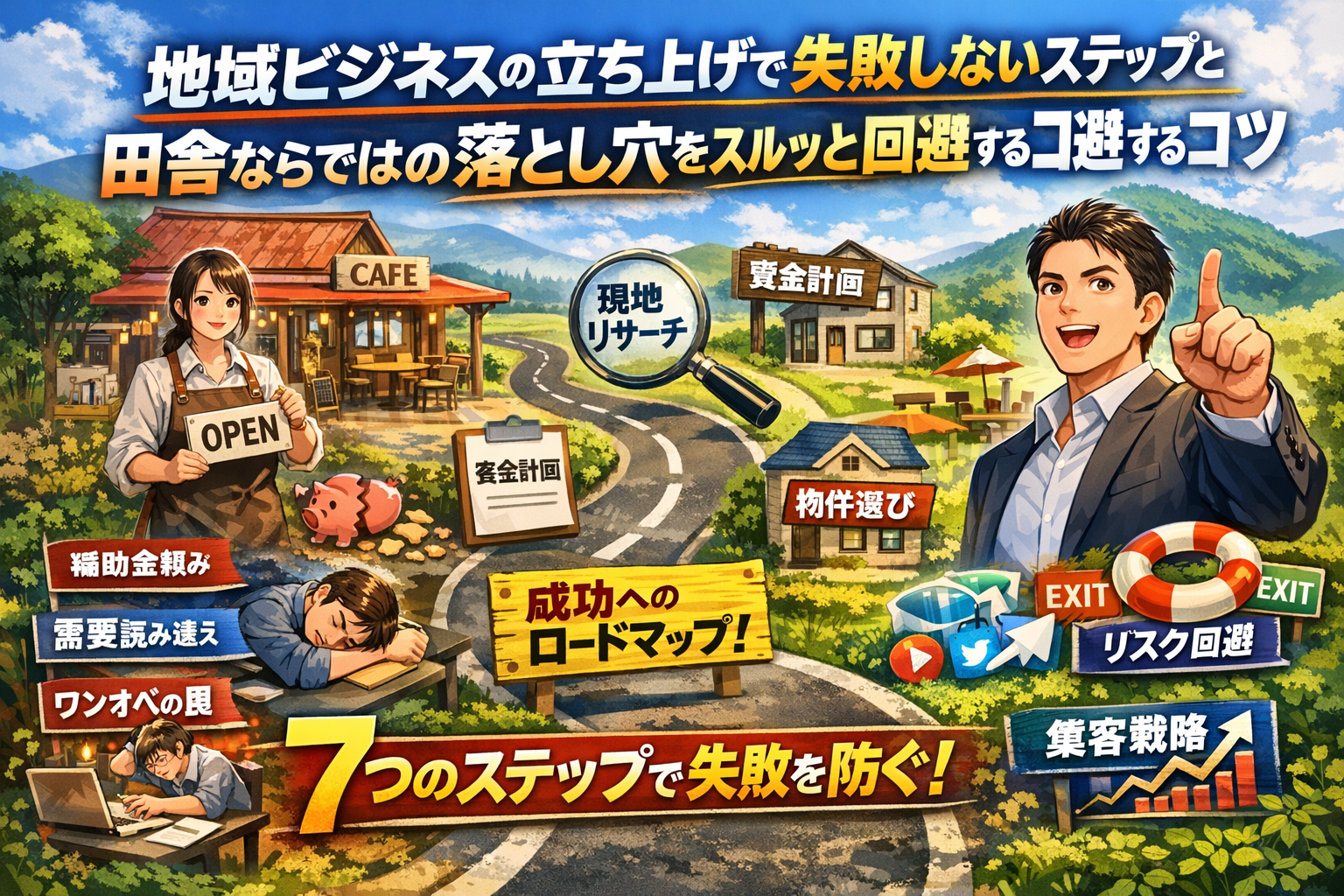 この記事では、そうした典型的な失敗パターンを感情と数字の両面から分解し、地域ビジネスの立ち上げで失敗しないための7つのステップとして再構築しています。ステップ1〜2のリサーチから、ビジネスモデルと資金計画、物件・立地選び、開業準備と集客、さらに開業後1〜3年の立て直しや撤退ラインの決め方までを、一つのロードマップとして通しで把握できる構成です。