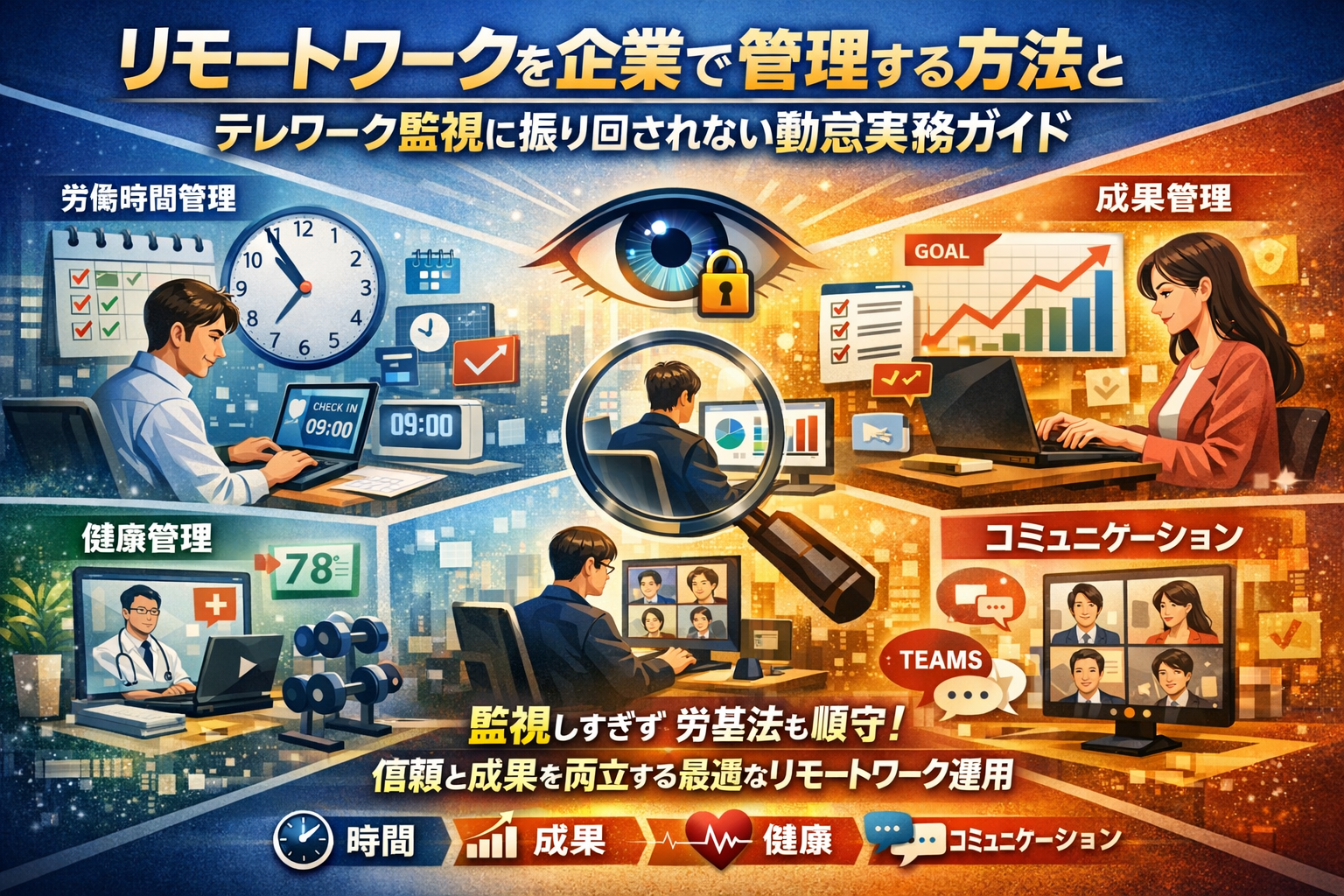 本記事では、リモートワークを企業で管理する方法を「時間」「成果」「コミュニケーション」「健康」の4軸に分解し、勤怠管理とテレワーク監視に振り回されない実務設計を提示します。テレワーク労働時間管理、在宅勤務時間管理アプリや勤務時間管理アプリ、PCログやテレワーク監視ツール一覧のどこまでを使うか、Teams勤怠管理やTeams出退勤連絡でどこまで回せるかを、規模別・運用別に整理します。