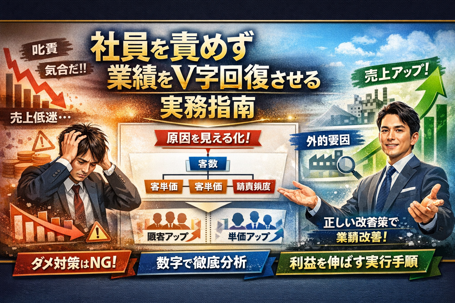 会社の売上が低調で、「このままでは資金繰りがもたないかもしれない」と感じているのに、会議では「もっと売れ」「気合が足りない」で終わっていないでしょうか。売上低迷を社員の責任にして営業を詰めても、数字は一時的にしか動かず、優秀な人材から辞めていきます。本当に変えるべきは人ではなく、売上低下の原因を分解して見える化し、正しい順番で手を打つ仕組みです。