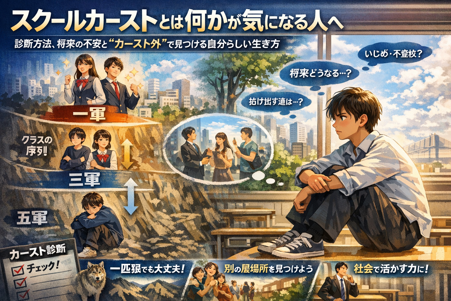 本記事ではまず、スクールカーストとは何かを簡単に整理し、一軍から五軍までの位置づけを冷静に分解します。そのうえで中学生高校生向けのスクールカースト診断で自分の位置とキャラを把握し、「属さない人」「一匹狼」「カースト外最強」という立ち位置の現実的な強みとリスクを具体的に示します。さらに、底辺や下位にいるときの苦しさへの対処法、親や先生が取るべき対応、学校カーストと会社カーストの共通点までつなげます。