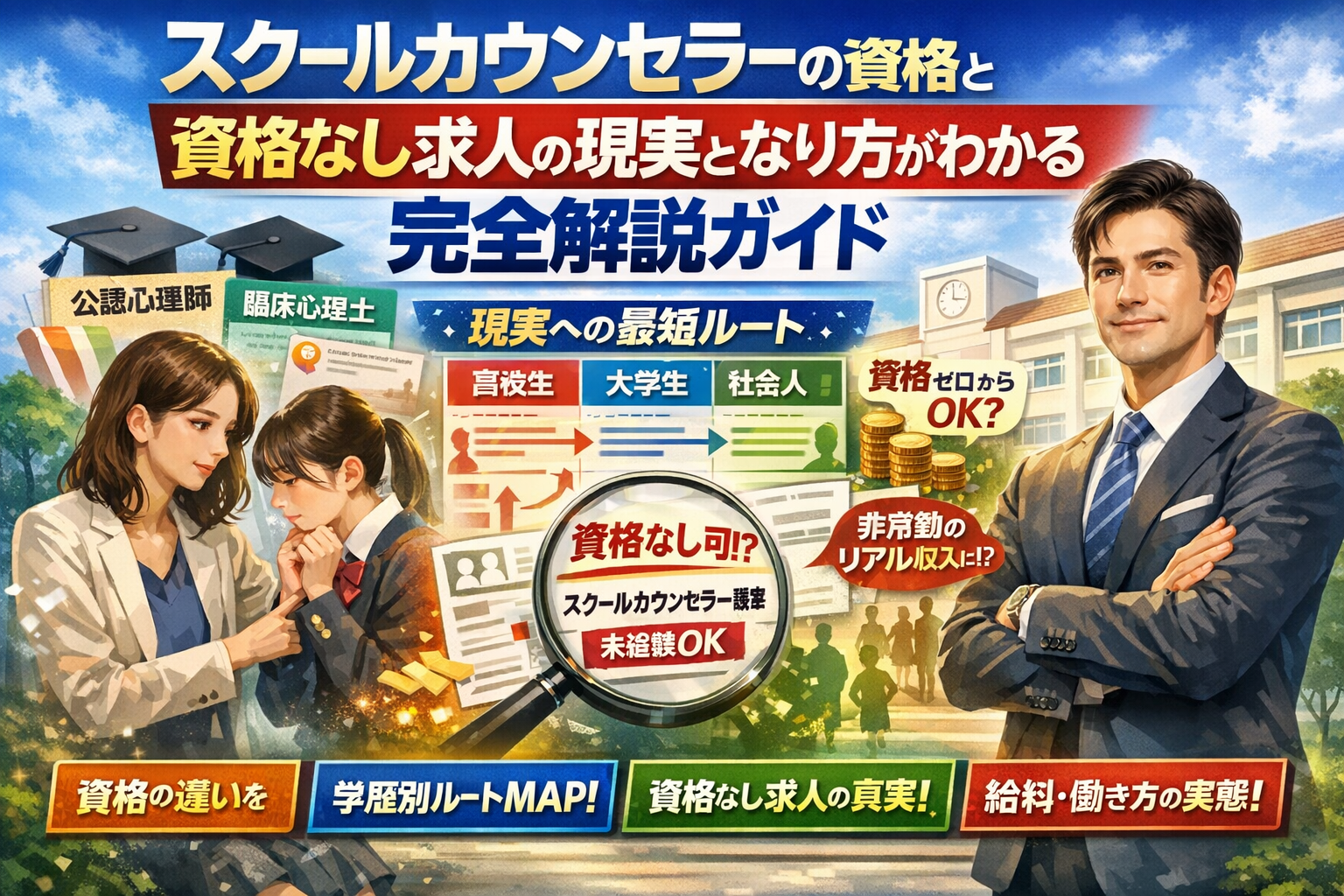 だからこそこの記事では、きれいごとではなく「どこで時間とお金をかけ、どこは割り切るべきか」を、年齢や学歴ごとに整理しました。スクールカウンセラーを本気で目指すあなたが、誤解やキャッチコピーに振り回されず、自分に合った現実的なルートを自信を持って選べるようにすること。それがこの記事を書いた目的です。