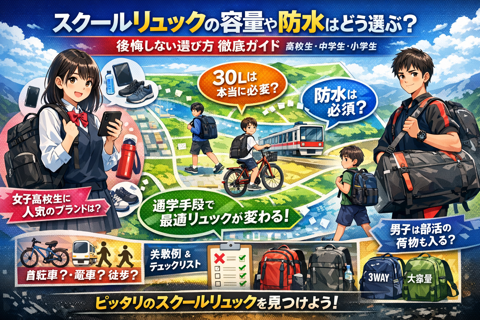 スクールリュック選びで本当に差がつくのは、「30リットルかどうか」「人気ブランドかどうか」ではありません。毎日の通学でどんな荷物を、どんなルートで、誰が運ぶかという条件を外すと、ほぼ確実に失敗します。容量の目安や防水・撥水の違い、軽量かつ大容量のおしゃれモデル、女子高校生に人気のイーストボーイやオリーブデオリーブ、FILA、ノースフェイス、アディダス、チャンピオンなどのブランド情報、スクバとリュック、3WAY通学バッグの比較は、すでに多くの商品ページやレビューで語られています。ですが、それだけを頼りに購入すると「ロッカーに入らない」「中学生通学リュックが重すぎて肩こり」「タブレットが雨で故障」「高校生女子にはデザインは可愛いが部活の荷物が入らない」といった構造的なミスマッチが起こります。この記事では、高校生・中学生・小学生別に、女子・男子、通学手段(自転車・電車・徒歩)や部活、学校ルールまで分解し、スクールバッグとリュックの併用パターンも含めて、どの条件ならどのタイプのスクールリュックが最適かをマップ化します。さらに、「とりあえず黒のボックス型」や「人気ランキング上位」のような選び方がなぜ危ないのかを、現場で多いクレーム例とチェックリストで可視化します。ネットの情報の海に埋もれず、後悔しない一つを短時間で絞り込むための実務ガイドとして活用してください。