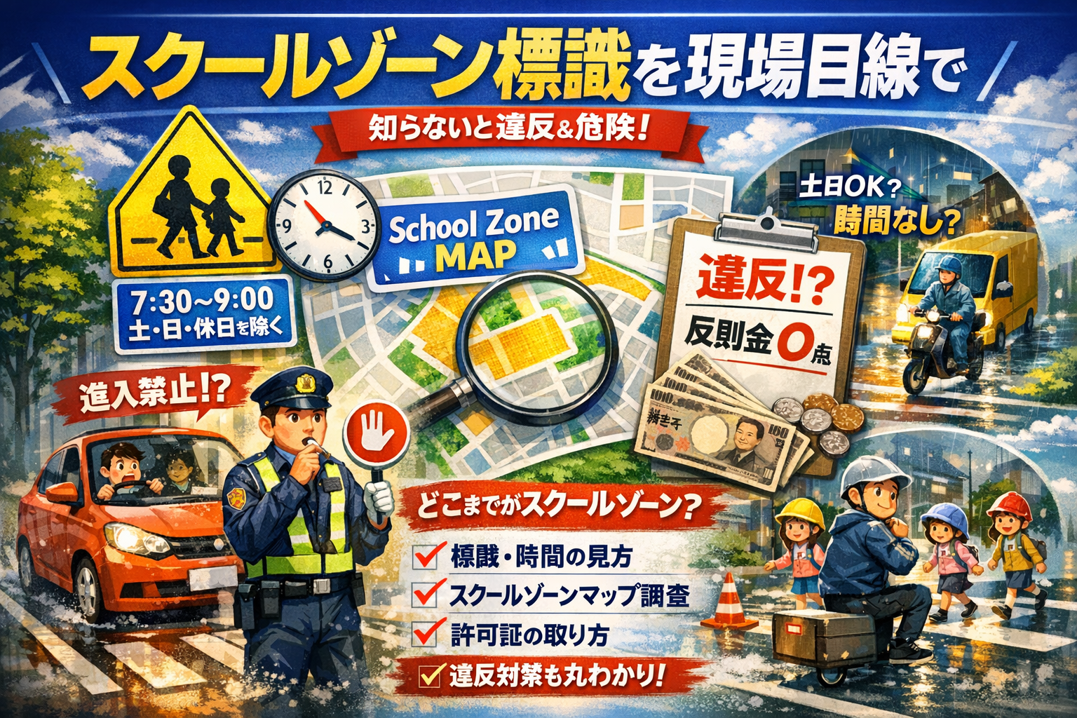 本記事では、スクールゾーン標識の意味や種類、見方、時間・土日の扱い、時間が書いていない場合の判断軸を現場目線で整理し、やってしまいがちな通行禁止違反のパターンと反則金・違反点数、後日通知の有無まで一気に確認できるようにします。さらに、自分の地域のスクールゾーンマップや時間帯通行禁止の調べ方、警察署での通行許可証の取り方、ナビと現地標識が食い違うときの優先ルールも具体的に示します。