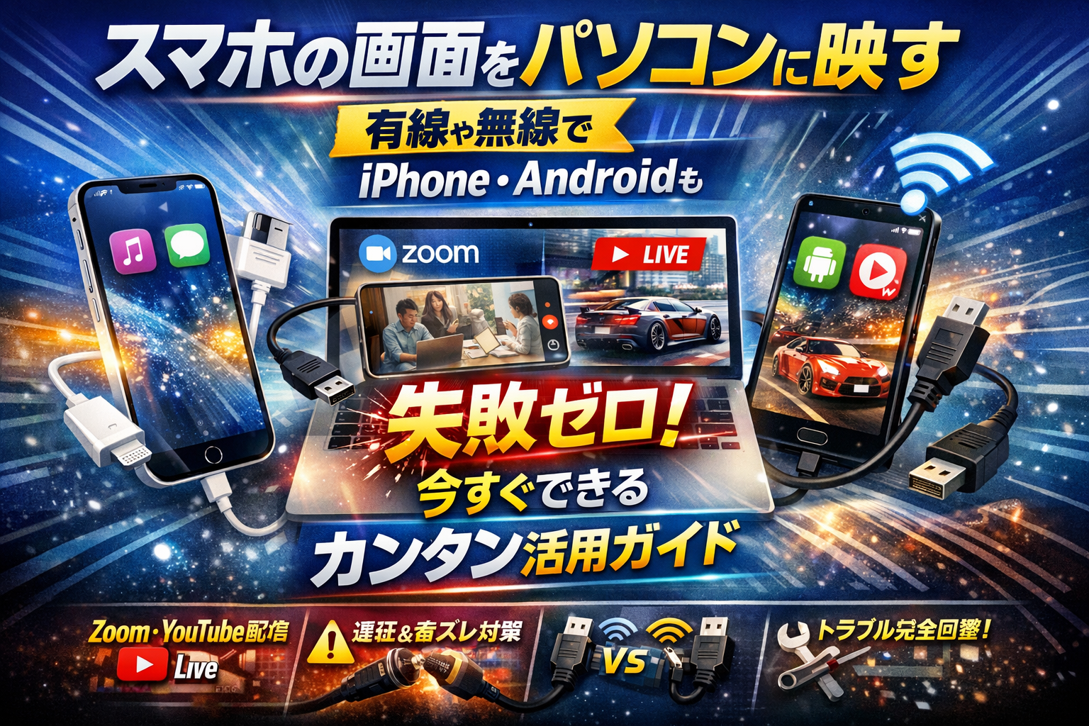 本記事は、「今すぐ自分の環境で最短で映す」ことと「失敗ゼロで運用する」ことを同時に満たすための実務ガイドです。スマホの画面をパソコンに映すAndroid向けの無線ミラーリングとUSB有線接続、iPhoneをWindowsに映す際の壁とLightningケーブルやHDMI変換アダプタの勘どころまで、OSと機器の組み合わせから一気に整理します。さらに、ZoomやTeams、YouTubeライブやゲーム実況、家族で動画を見るライトな用途まで、シーン別に「有線か無線か」の最適解をはっきり示します。