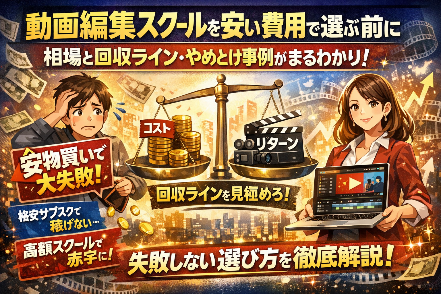 あなたの「動画編集スクール 安い」検索は、受講料を1円でも抑えるためではなく、最小コストで確実に元を取りたいからのはずです。ところが一般的な検索結果やまとめ記事は、料金相場やランキング、オンラインスクールの受講料比較で終わりがちで、「どこまで安く攻めていいか」「どのラインで回収不能になるか」までは踏み込んでいません。ここを見誤ると、サブスク型の安い講座を渡り歩いて何も身につかない、あるいは高額コースに通っても副業やフリーランスで稼げず手元の現金だけが減る状態に陥ります。