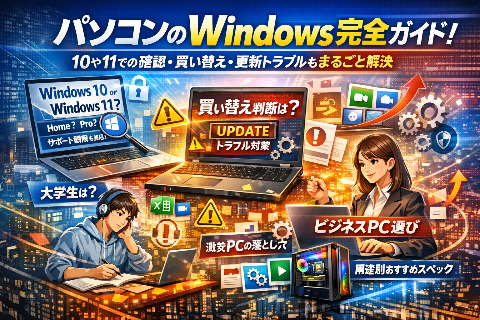 本記事は、大学生のパソコン選びから中小企業のPCリプレイス、リモートワーク用のWindowsノートパソコン選定、中古パソコンWindows11の見極めまでを一気通貫で整理した実務ガイドです。最初に1分でできるOSとバージョン確認方法を押さえ、次に「Windows11へアップデートすべきか」「買い替えた方が得か」を用途とスペック、サポート期限で判断します。さらに、買ってはいけない激安PCの条件、Windows更新が重い・終わらないときの安全な対処、ビジネスや学業で成果を出すためのおすすめ構成まで、現場の失敗事例をベースに具体的に示します。