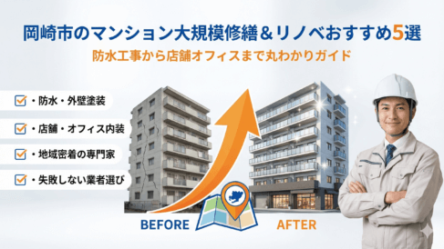 愛知県岡崎市のマンション大規模修繕工事業者おすすめ5選!防水工事や店舗オフィスリノベーションまで丸わかりガイド 愛知県岡崎市で「そろそろ大規模修繕かも」と感じていませんか。一般にマンションの大規模修繕は12~15年周期が目安とされ、外壁や防水の劣化を放置すると、将来の工事費が膨らむリスクがあります。とくに日射や降雨の影響を受ける外装・防水は、早めの診... 2026.01.10