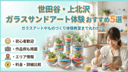 世田谷区上北沢でガラスアート体験教室おすすめ5選!サンドアートやものづくり体験教室まで丸わかり 「上北沢から近くて、短時間でできるガラス体験はないかな?」そんな声に応えるために、世田谷区上北沢で始めやすいガラスアート体験の魅力と選び方をまとめました。駅近で通いやすく、平日夕方や週末のすき間時間でも参加しやすい体験が見つかります。初めて... 2026.01.10