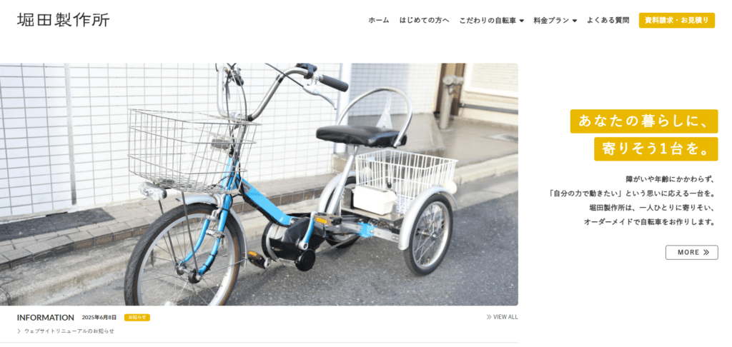 | 特徴 | 堀田製作所は、障がいや年齢にかかわらず「自分の力で動きたい」という思いに応えるオーダーメイド自転車を製作している工房です。お一人おひとりの身体的な特徴や生活スタイル、利用環境を丁寧にお伺いし、安心して長くお使いいただける一台を手づくりでお届けしています。創業から45年、約3,000台の製作実績を持ち、補助金制度を活用したご提案も行っております。初めての方にもわかりやすい料金プランや製作事例を公開し、相談も随時受け付けております。あなたの暮らしに寄りそう、自分らしい一台づくりをお手伝いいたします。 |