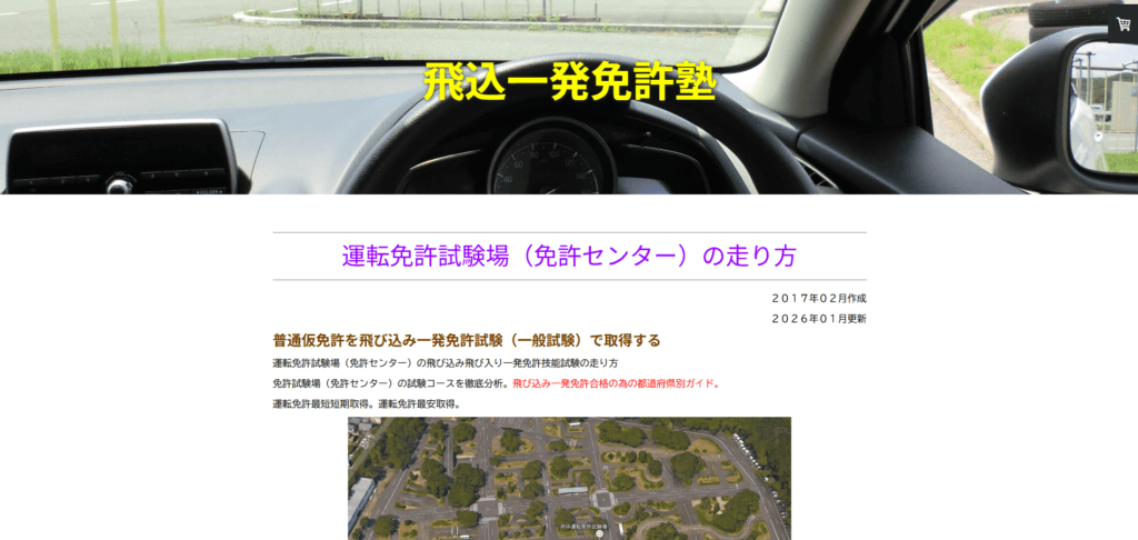特徴飛込一発免許塾は、最短での合格を目指す方に向けた日本全国の免許試験場(免許センター)での飛込み技能試験に合格するためのノ飛込一発免許塾は、教習所に通わずに運転免許を取得する「飛び込み(一発)免許試験」に挑戦する方へ向けた、試験攻略情報を提供する専門サイトです。日本全国の免許試験場(免許センター)を対象に、技能試験のコース情報や走行時の注意点、減点されやすいポイントなどを分かりやすく解説しています。