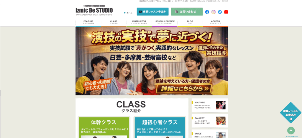| 特徴 | Izmic Be STUDIO(イヅミックビースタジオ)は、池袋西口にあるダンス・演技・子供ミュージカル・体幹トレーニング・アイドル育成をトータルで学べるスタジオです。JR池袋駅徒歩7分、東京メトロ要町駅徒歩3分、10:00~22:00・年中無休で通いやすい環境をご用意しています。日芸・多摩美・桐朋など演劇系大学の実技対策に強く、少人数制と個別指導で合格率向上をサポートします。冬期講習やオンライン対策、年末年始の集中ワークショップなど、時期に合わせた実践的カリキュラムも充実。初心者からプロ志望まで、基礎から応用、オーディション対策まで一貫して学べます。まずは体験レッスンで、上達への第一歩を踏み出してみませんか。 |