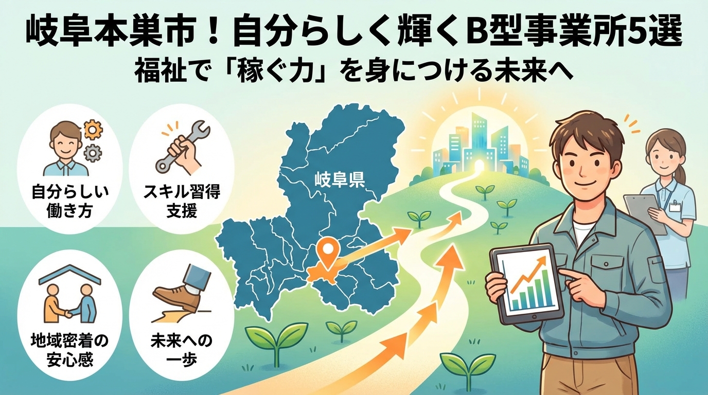 本記事は、岐阜本巣市で自分らしくいれる就労継続支援B型を探す方のために、みつば・杉の子・ほたるといった本巣市障がい者就労支援センターから、フォレストマザー事業所、B型事業所フローラ、就労継続支援B型事業所ミライ、LeaLea株式会社までを一度に俯瞰し、「作業」「ペース」「人間関係」「将来像」といった軸で比較できるよう整理しました。