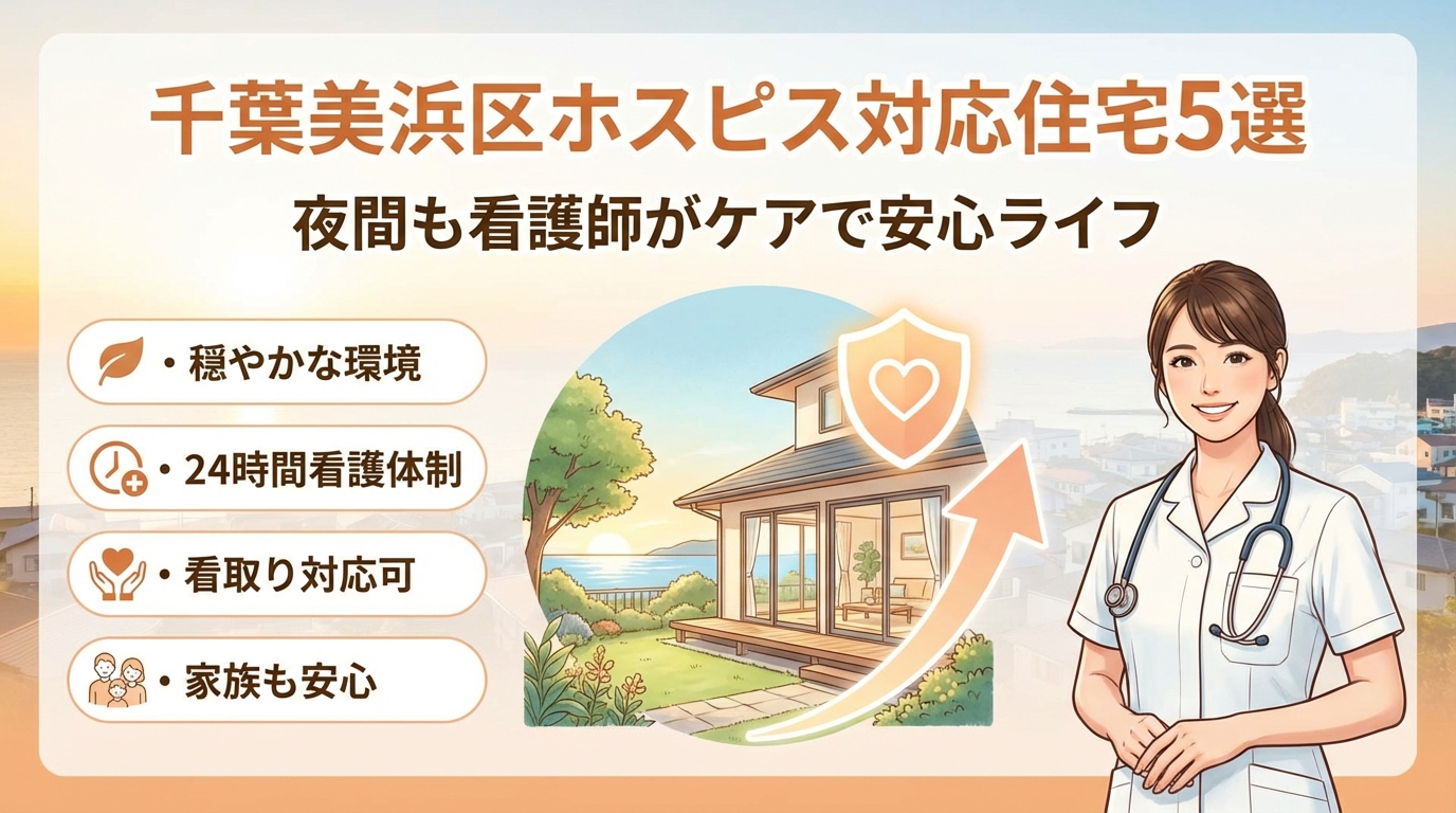 千葉市美浜区でホスピス対応型住宅を探すと、リベル千葉美浜や周辺の有料老人ホーム、ホスピス型住宅など候補が5件ほど浮かび上がります。しかし、その一覧だけを見比べて選ぶと「穏やかに過ごす」はほぼ偶然任せになります。24時間看護や医療連携、看取り対応可という言葉の裏に、夜間の実際の体制や救急搬送の方針、面会制限の運用差が隠れているからです。さらに、ホスピス対応型住宅と緩和ケア病棟、ナーシングホーム、一般的な有料老人ホームとの違いを曖昧にしたまま距離と月額費用だけで決めると、転院の繰り返しや、最期に間に合わないといった取り返しのつかない損失が生まれます。この記事では、千葉美浜区と周辺の代表的なホスピス対応型住宅5選を比較しながら、本当に見るべきポイントだけに絞ったチェックリスト、生活保護を含む費用の考え方、見学時に聞くべき夜間・急変・看取りの質問、家族の働き方や通いやすさ別に合う施設タイプを具体的に整理します。写真や口コミだけではわからない「穏やかさの条件」を言語化しているので、この数分をかけずに検討を進めること自体が、大きなリスクになります。