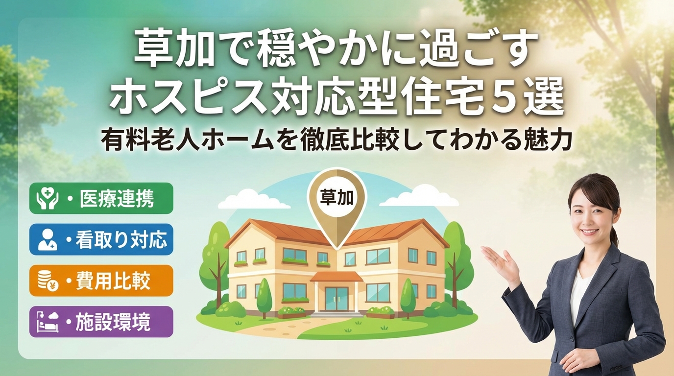 草加でホスピス対応型住宅を探すと、料金や医療対応の一覧はすぐ見つかりますが、「がん末期や難病の家族が本当に穏やかに過ごせるか」という核心までは見えてきません。24時間看護師常駐と書かれていても夜間の人員配置や急変時に誰が最初に居室へ駆けつけるのか、面会自由とあっても実際には家族が気を遣う運用なのかで、最期の時間の質は大きく変わります。草加市は東京都心へのアクセスが良く住みやすい環境が評価されていますが、同じ草加でもReHOPE草加松原、ホスピス対応型住宅リベル草加、フレアスメディカルケアホーム草加、さらにサニーライフ草加やニチイホーム草加のような有料老人ホームでは、医療・費用・生活・面会ルールのバランスがまったく違います。この記事では、これらの施設を一つの表に並べて比較しながら、生活保護利用の可否や月額費用の総額イメージ、サービス付き高齢者向け住宅の見落としがちな問題点、昼と夜の見学で確認すべきポイントまで整理します。口コミやランキングだけでは分からない「痛みのコントロール」「眠りの質」「家族の通いやすさ」を草加という街の文脈で具体的に言語化しているため、ここで示す比較軸を知らずに入居先を決めること自体が、後から取り返せない損失になります。