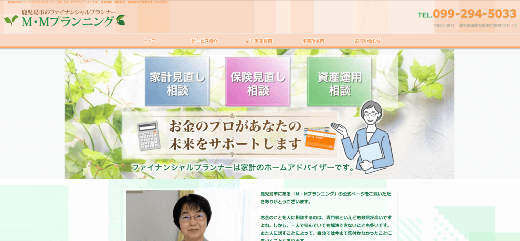 | 特徴 | 鹿児島市のファイナンシャルプランナー(FP)「M・Mプランニング」は、暮らしとお金に関するお悩みをトータルでサポートする相談窓口です。資産運用や老後資金の準備、相続対策など、お一人おひとりの状況や将来設計に合わせたオーダーメイドのプランをご提案いたします。 |