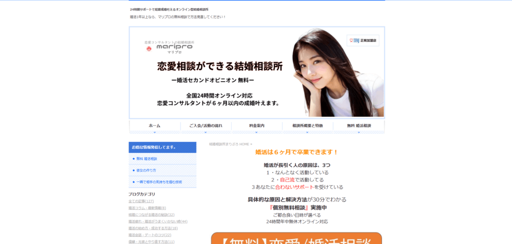 | 特徴 | 結婚相談所マリプロは、24時間365日いつでも相談できるオンライン完結型の結婚相談所です。婚活が1年以上続いている方や、「何から見直せばいいのか分からない」とお悩みの方に、短期成婚を叶えるための具体的なサポートをご提供しています。 恋愛コンサルタントが、あなたの性格や価値観、これまでの恋愛・婚活状況を丁寧にヒアリングし、「なんとなく自己流で頑張っている」状態から抜け出すための最適な婚活プランを一緒に作成いたします。 会員数10万名以上のデータベースを活用しながら、お見合いの組み方、メッセージのやりとり、デートの進め方まで細かくサポートいたしますので、恋愛に不慣れな方や異性との会話が苦手な方でも安心して活動していただけます。 オンライン相談は年中無休で、対応が早いことも特長です。「このLINEの返信どうしたらいい?」「デートの後の連絡が不安」など、ちょっとしたお悩みにもその都度お答えし、不安を一人で抱え込まない婚活を実現します。 また、初めての方には、婚活がうまくいかない原因と解決策が30分で分かる「個別無料相談」をご用意しております。結婚に向けて具体的に動き出したい方は、まずはお気軽にご相談ください。マリプロは、6ヶ月での婚活卒業を目指し、あなたの「本当に幸せな結婚」を全力でサポートいたします。 |