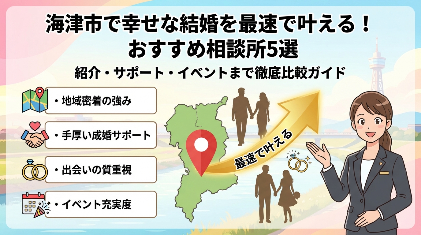 海津市から通える結婚相談所を検索しても、「IBJ加盟」「TMS加盟」「海津市密着パーティー」が並び、結局どこを選べば最速で幸せな結婚に近づけるのか見えなくなっていませんか。結論として、今年中〜1年以内の成婚を狙うなら、大垣や瑞穂、岐阜、名古屋エリアの相談所と地元の婚活サービスを、自分の年齢・職業・ライフスタイルに合わせて戦略的に組み合わせる必要があります。ところが多くの人は、会員数や入会金の安さ、「最速成婚」という宣伝だけで判断し、3ヶ月目から申込が止まる、移動負担でデートが続かない、途中休会でダラダラ長期化するといった見えない損失を抱えています。この記事では、アプリ婚活3年目の海津市在住30代女性や、製造業勤務40代男性のリアルなシナリオを起点に、平均6〜12ヶ月での成婚プロセス、IBJとTMS、海津市密着パーティーの違い、数字の裏側にある「会員属性」「サポート体制」「情報設計」の見抜き方まで分解します。そのうえで、揖斐川や長良川沿いのデート、名古屋グルメ、伊勢や志摩、岐阜・三重のグランピングやサウナ旅行など、結婚後のライフスタイルまで具体的に描きながら、「今年こそ結婚したい」あなたのための1年以内成婚ロードマップを提示します。この数分を惜しむかどうかで、これから1年の動き方と結果は大きく変わります。