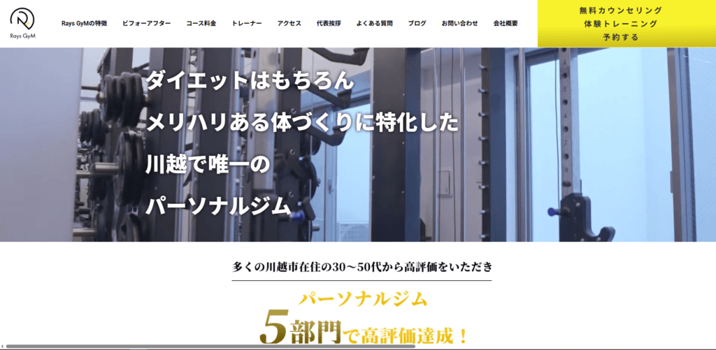 | 特徴 | Rays GyM 川越店/川越アカシア通り店は、ダイエットはもちろん、ヒップアップやくびれ作りなどメリハリある体づくりに特化した川越唯一のパーソナルジムです。医療系国家資格・国内難関資格を持つプロトレーナーがマンツーマンで指導し、上級食育アドバイザーによる24時間対応の食事サポートもご提供します。女性トレーナーも在籍し、反り腰や下っ腹などのお悩みにも的確に対応いたします。ボディメイク大会優勝者だからこそ伝えられる実践的ノウハウで、効率的に理想の体へ導きます。川越駅から徒歩圏内に2店舗展開し、上質な空間で60分のパーソナルトレーニング、無料ウェア・シューズ、アフタープロテイン付き。無料カウンセリングや体験は随時受付中です。 |