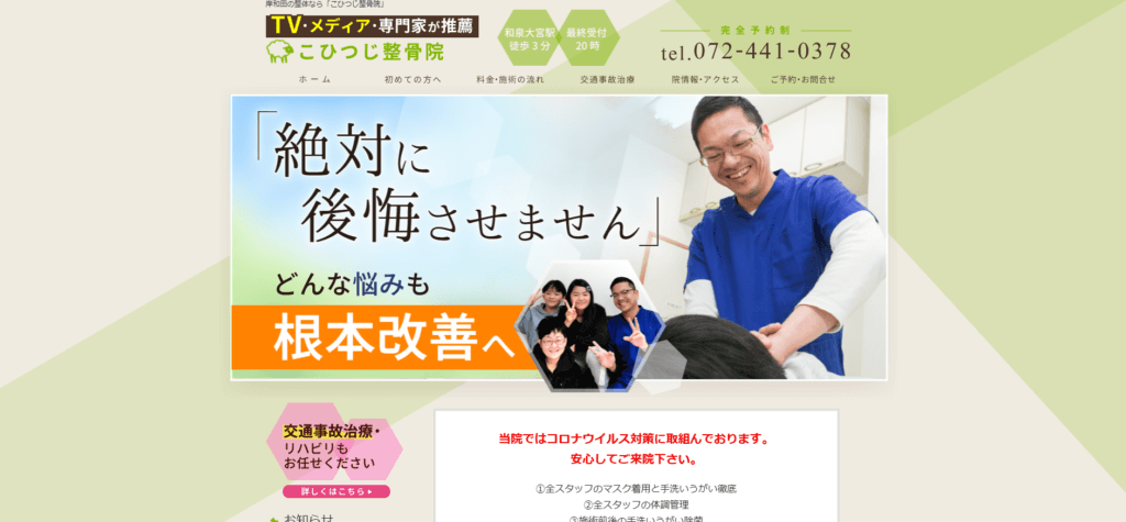 特徴大阪府岸和田市の「こひつじ整骨院」は、のべ6万人以上の施術実績を持つ院長が、腰痛・肩こり・坐骨神経痛・ヘルニア・四十肩・五十肩・膝痛など、つらい症状を根本から改善へ導く整骨院です。丁寧なカウンセリングと検査で原因を見極め、お一人お一人の状態に合わせたオーダーメイドの整体を行います。バキバキしない優しい施術ですので、お子様からご年配の方まで安心して受けていただけます。骨盤や姿勢の歪み、自律神経の乱れにも総合的にアプローチし、再発しにくい身体づくりをサポートいたします。院内はバリアフリーで衛生管理も徹底しており、車椅子やベビーカーの方も通いやすい環境です。和泉大宮駅から徒歩3分、駐車場も完備しており、岸和田市内はもちろん、和泉市・貝塚市・泉佐野市など市外からも多くの方が来院されています。長年どこへ行っても良くならない痛みやしびれでお悩みの方は、ぜひ一度ご相談ください。